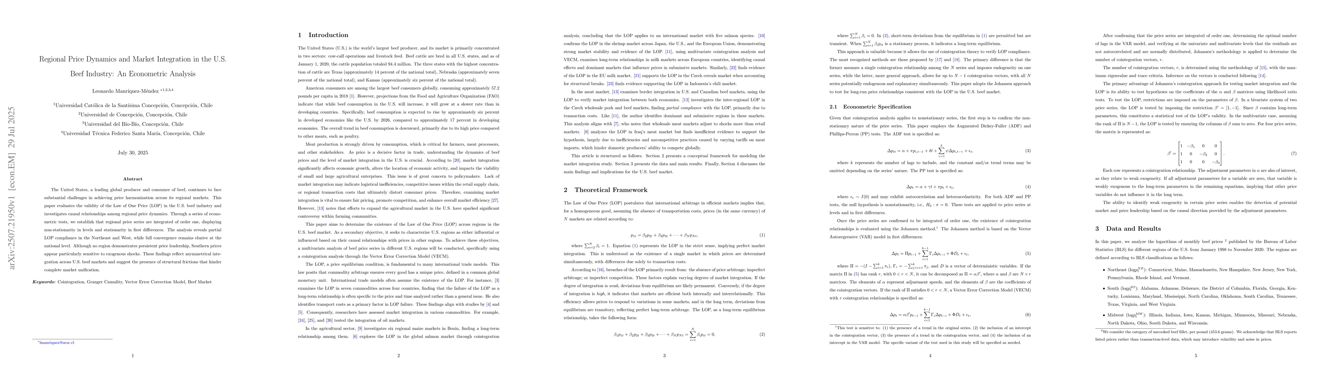 The United States, a leading global producer and consumer of beef, continues to face substantial challenges in achieving price harmonization across its regional markets. This paper evaluates the validity of the Law of One Price (LOP) in the U.S. beef industry and investigates causal relationships among regional price dynamics. Through a series of econometric tests, we establish that regional price series are integrated of order one, displaying non-stationarity in levels and stationarity in first differences. The analysis reveals partial LOP compliance in the Northeast and West, while full convergence remains elusive at the national level. Although no region demonstrates persistent price leadership, Southern prices appear particularly sensitive to exogenous shocks. These findings reflect asymmetrical integration across U.S. beef markets and suggest the presence of structural frictions that hinder complete market unification.