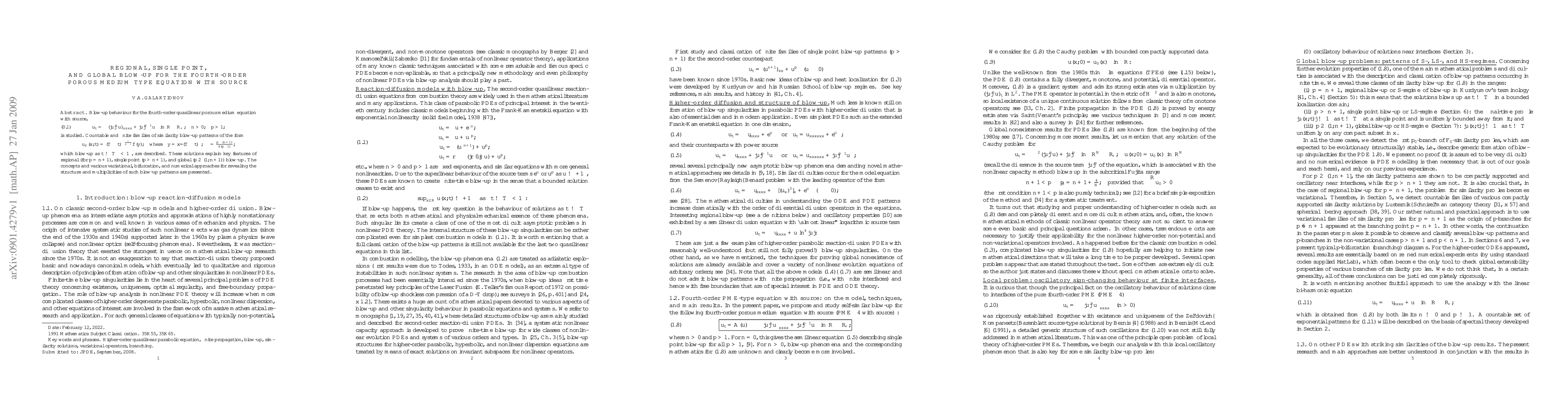 Three types of blow-up for a fourth-order degenerate reaction-diffusion equation are studied by a combination of analytic and numerical methods. At the critical values of parameters, there occurs a variational problem with a countable set of solutions obtained by Lysternik--Shnirelman category theory, which then are extended to neighbouring values of parameters by a homotopy-like approach.