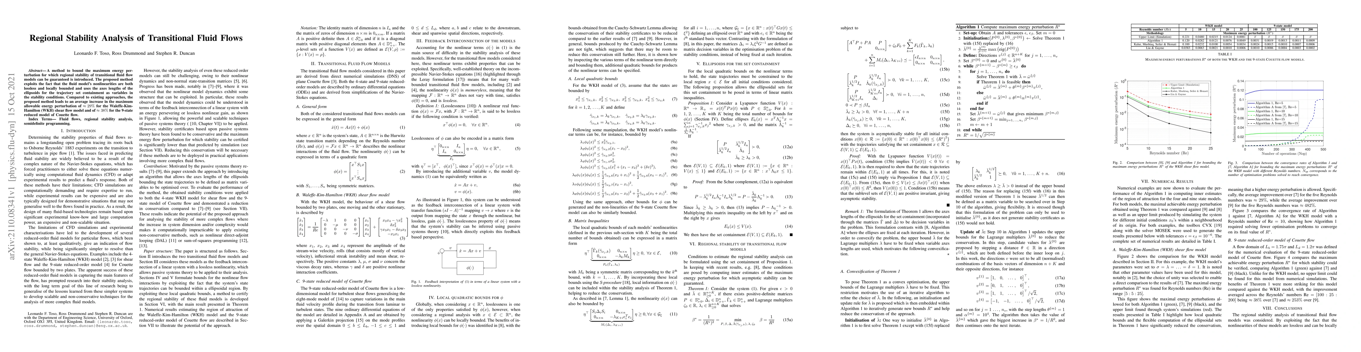 A method to bound the maximum energy perturbation for which regional stability of transitional fluid flow models can be guaranteed is introduced. The proposed method exploits the fact that the fluid model's nonlinearities are both lossless and locally bounded and uses the axes lengths of the ellipsoids for the trajectory set containment as variables in the stability conditions. Compared to existing approaches, the proposed method leads to an average increase in the maximum allowable energy perturbation of 29% for the Waleffe-KimHamilton (WKH) shear flow model and of 38% for the 9-state reduced model of Couette flow.