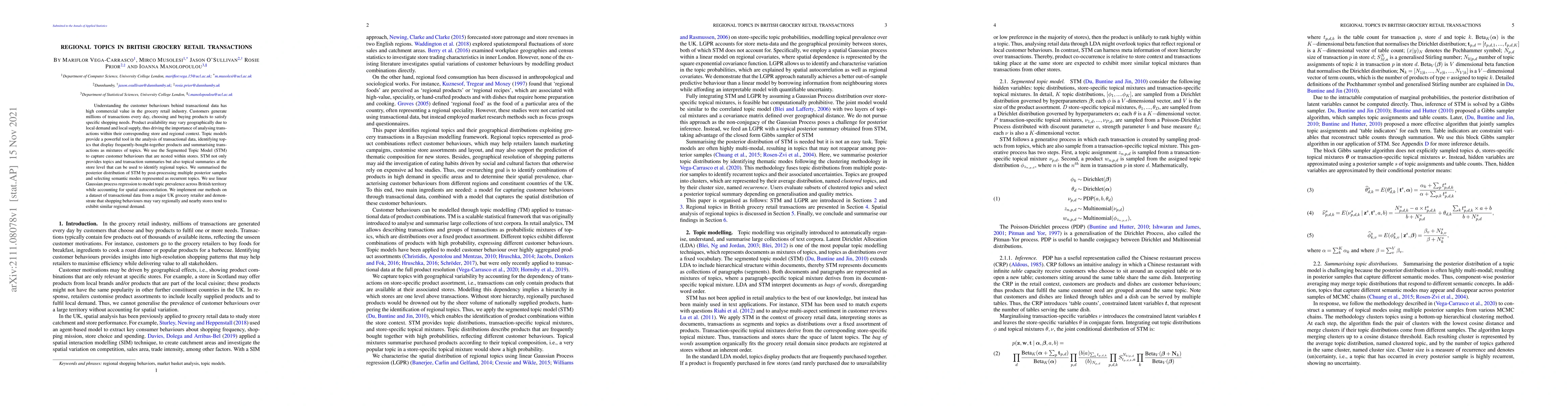 Understanding the customer behaviours behind transactional data has high commercial value in the grocery retail industry. Customers generate millions of transactions every day, choosing and buying products to satisfy specific shopping needs. Product availability may vary geographically due to local demand and local supply, thus driving the importance of analysing transactions within their corresponding store and regional context. Topic models provide a powerful tool in the analysis of transactional data, identifying topics that display frequently-bought-together products and summarising transactions as mixtures of topics. We use the Segmented Topic Model (STM) to capture customer behaviours that are nested within stores. STM not only provides topics and transaction summaries but also topical summaries at the store level that can be used to identify regional topics. We summarised the posterior distribution of STM by post-processing multiple posterior samples and selecting semantic modes represented as recurrent topics. We use linear Gaussian process regression to model topic prevalence across British territory while accounting for spatial autocorrelation. We implement our methods on a dataset of transactional data from a major UK grocery retailer and demonstrate that shopping behaviours may vary regionally and nearby stores tend to exhibit similar regional demand.