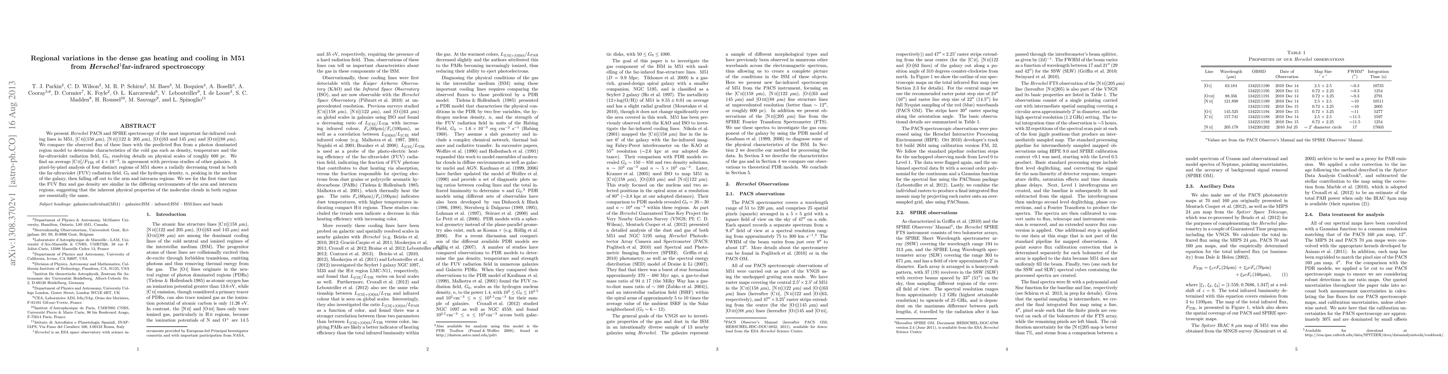 The study analyzes M51 galaxy using Herschel spectroscopy to investigate regional variations in dense gas heating and cooling, finding a radially decreasing trend in the far-ultraviolet radiation field and hydrogen density from the nucleus outwards.