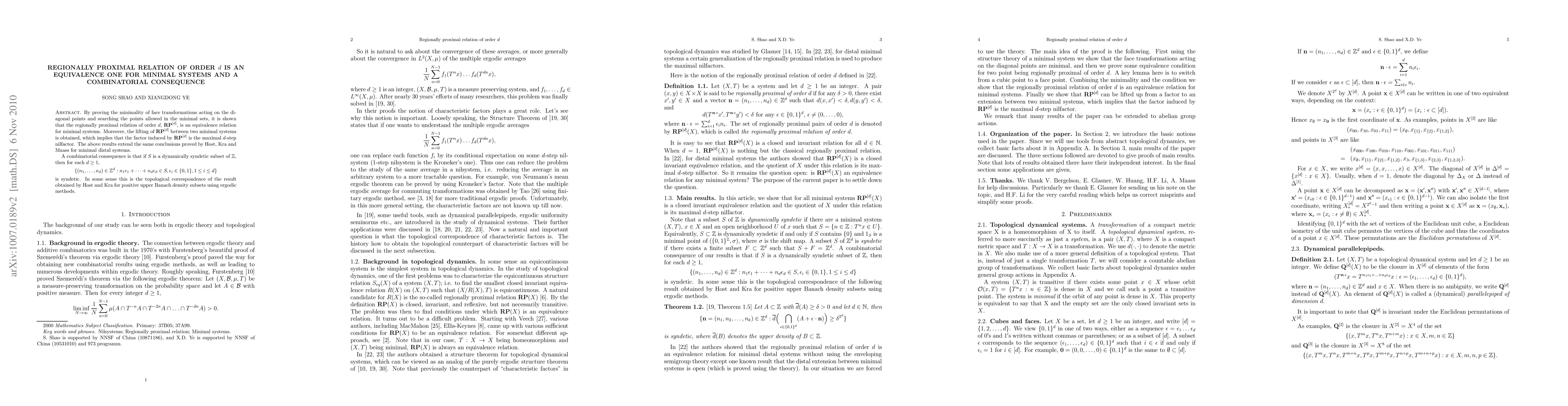 This paper proves that the regionally proximal relation of order d is an equivalence relation for minimal systems, extending previous results to include face transformations acting on diagonal points. It also leads to a combinatorial consequence showing that certain sets in the integers have syndetic properties.