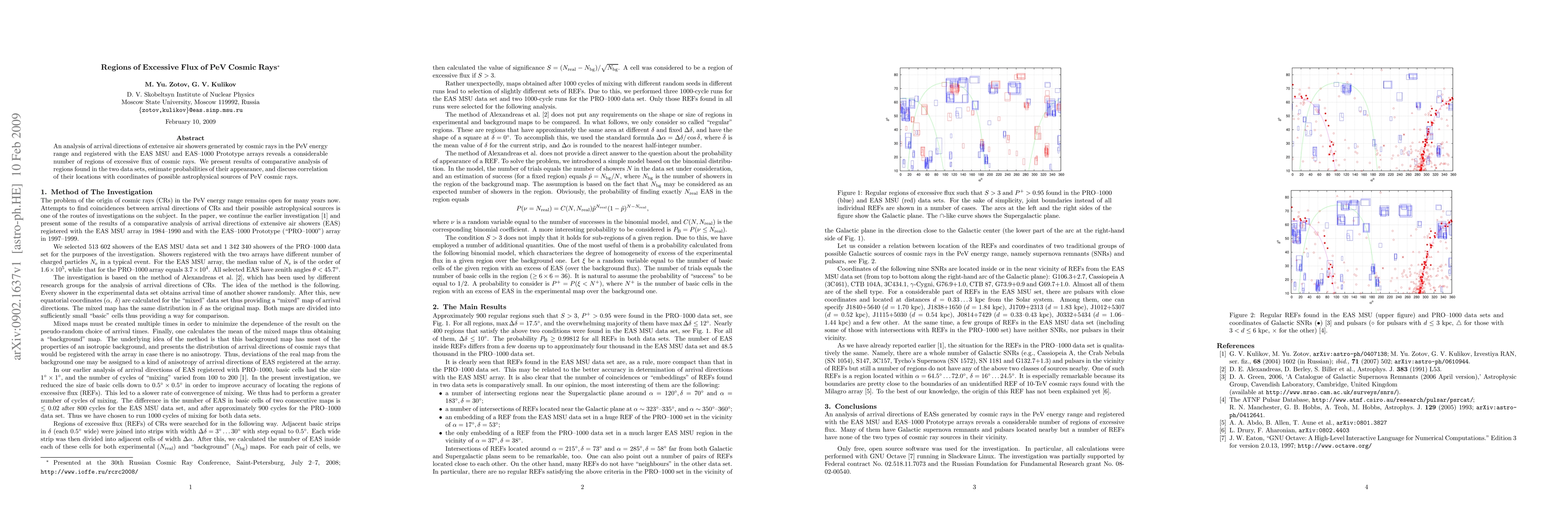 Researchers found regions of excessive PeV cosmic ray flux using data from EAS MSU and EAS-1000 Prototype arrays, suggesting possible astrophysical sources.