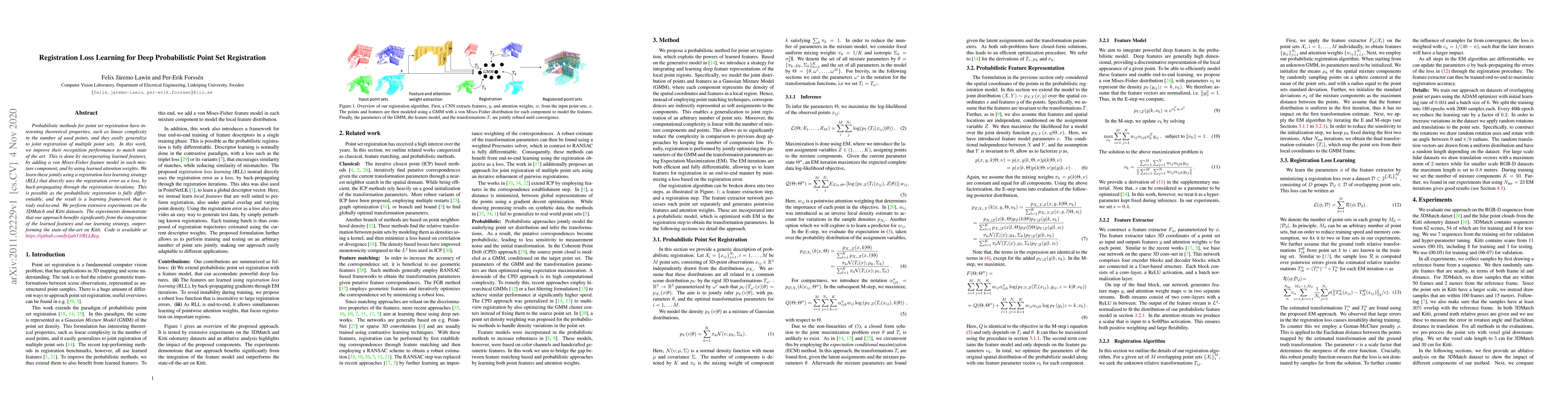 Probabilistic methods for point set registration have interesting theoretical properties, such as linear complexity in the number of used points, and they easily generalize to joint registration of multiple point sets. In this work, we improve their recognition performance to match state of the art. This is done by incorporating learned features, by adding a von Mises-Fisher feature model in each mixture component, and by using learned attention weights. We learn these jointly using a registration loss learning strategy (RLL) that directly uses the registration error as a loss, by back-propagating through the registration iterations. This is possible as the probabilistic registration is fully differentiable, and the result is a learning framework that is truly end-to-end. We perform extensive experiments on the 3DMatch and Kitti datasets. The experiments demonstrate that our approach benefits significantly from the integration of the learned features and our learning strategy, outperforming the state-of-the-art on Kitti. Code is available at https://github.com/felja633/RLLReg.