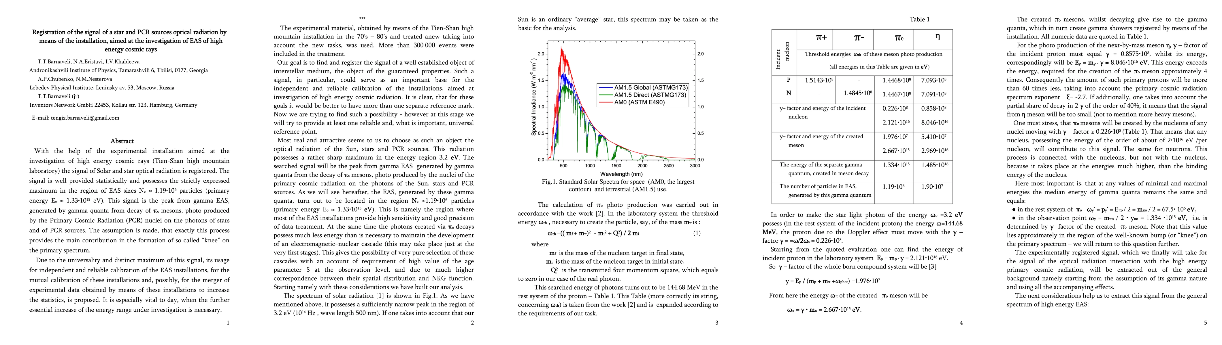 With the help of the experimental installation aimed at the investigation of high energy cosmic rays (Tien-Shan high mountain laboratory) the signal of Solar and star optical radiation is registered. The signal is well provided statistically and possesses the strictly expressed maximum in the region of EAS sizes Ne 1.19 106 particles (primary energy Eo 1.33 1015 eV). This signal is the peak from gamma EAS, generated by gamma quanta from decay of pi zero mesons, photo produced by the Primary Cosmic Radiation (PCR) nuclei on the photons of stars and of PCR sources. The assumption is made, that exactly this process provides the main contribution in the formation of so called knee on the primary spectrum. Due to the universality and distinct maximum of this signal, its usage for independent and reliable calibration of the EAS installations, for the mutual calibration of these installations and, possibly, for the merger of experimental data obtained by means of these installations to increase the statistics, is proposed. It is especially vital to day, when the further essential increase of the energy range under investigation is necessary.