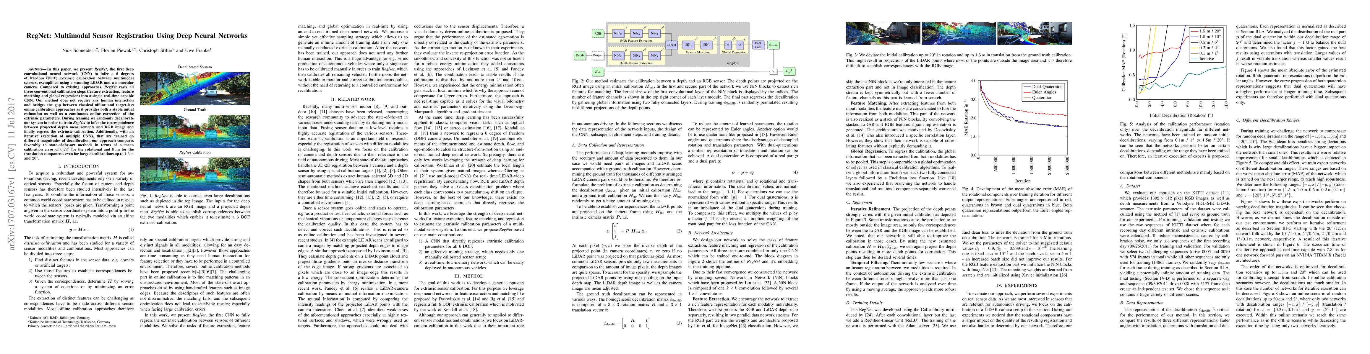 RegNet is a novel deep convolutional neural network designed to infer 6 DOF extrinsic calibration between multimodal sensors like LiDAR and camera, integrating feature extraction, matching, and regression into a single CNN. It achieves superior calibration accuracy with a mean error of 0.28 degrees and 6 cm, outperforming existing methods even for large decalibrations.