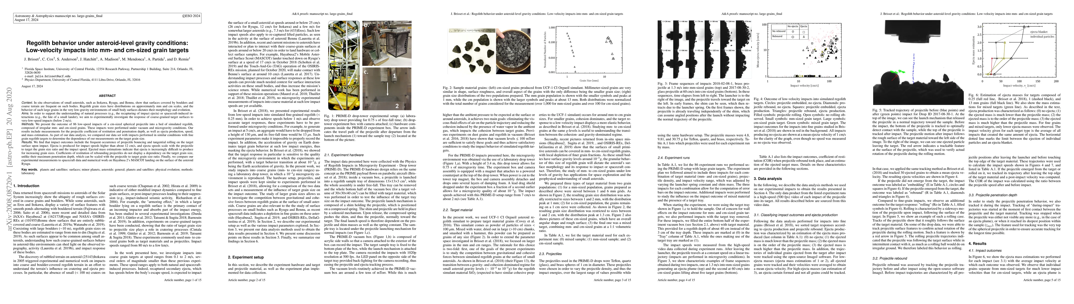 This study experimentally investigates the behavior of regolith under asteroid-level gravity during low-velocity impacts, finding frequent projectile bouncing and rolling, and ejecta production at speeds above 12 cm/s. The results show that ejecta mass decreases with larger grain sizes, and penetration depth scales with the projectile-to-target grain size ratio, providing insights into natural and spacecraft-induced surface interactions.
