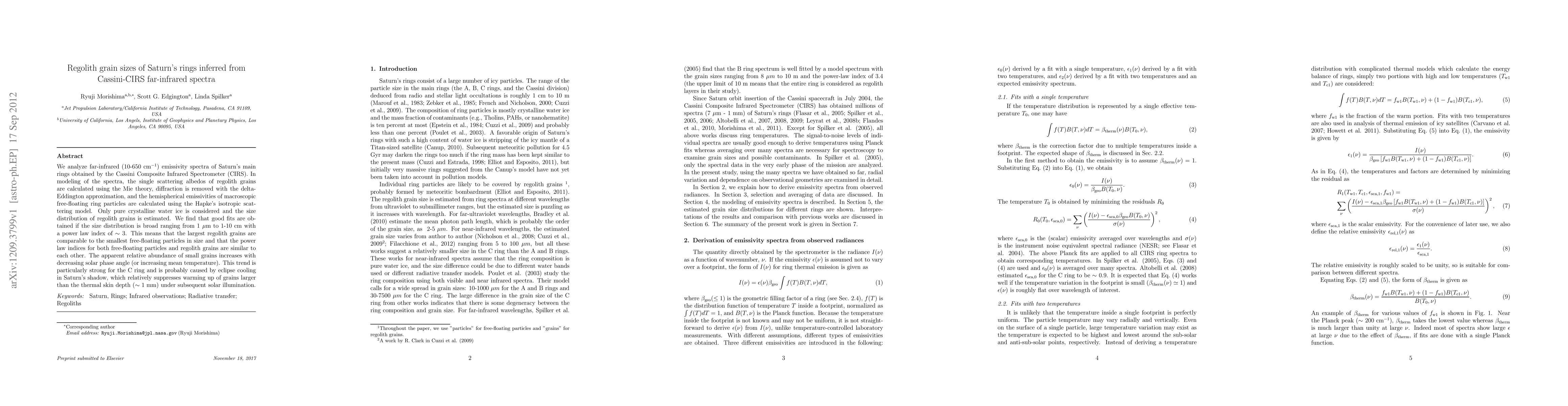 We analyze far-infrared (10-650 cm$^{-1}$) emissivity spectra of Saturn's main rings obtained by the Cassini Composite Infrared Spectrometer (CIRS). In modeling of the spectra, the single scattering albedos of regolith grains are calculated using the Mie theory, diffraction is removed with the delta-Eddington approximation, and the hemispherical emissivities of macroscopic free-floating ring particles are calculated using the Hapke's isotropic scattering model. Only pure crystalline water ice is considered and the size distribution of regolith grains is estimated. We find that good fits are obtained if the size distribution is broad ranging from 1 $\mu$m to 1-10 cm with a power law index of $ \sim 3$. This means that the largest regolith grains are comparable to the smallest free-floating particles in size and that the power law indices for both free-floating particles and regolith grains are similar to each other. The apparent relative abundance of small grains increases with decreasing solar phase angle (or increasing mean temperature). This trend is particularly strong for the C ring and is probably caused by eclipse cooling in Saturn's shadow, which relatively suppresses warming up of grains larger than the thermal skin depth ($\sim$ 1 mm) under subsequent solar illumination.