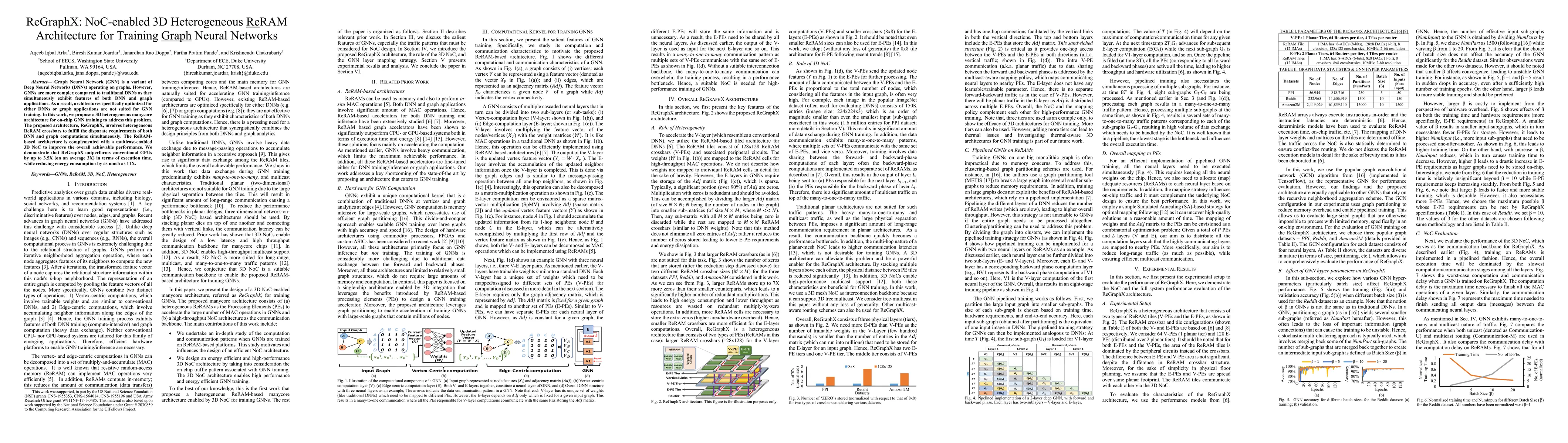 ReGraphX is a 3D heterogeneous ReRAM architecture designed for efficient training of Graph Neural Networks (GNNs). It combines ReRAM crossbars and a multicast-enabled 3D NoC to optimize both DNN and graph computations, achieving up to 3.5X faster execution and 11X lower energy compared to conventional GPUs.