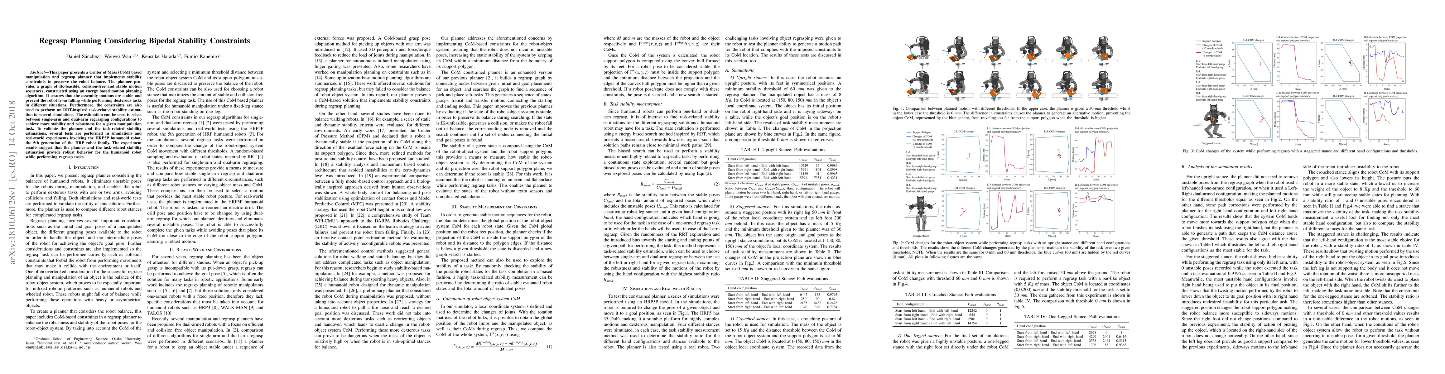 This paper presents a Center of Mass (CoM) based manipulation and regrasp planner that implements stability constraints to preserve the robot balance. The planner provides a graph of IK-feasible, collision-free and stable motion sequences, constructed using an energy based motion planning algorithm. It assures that the assembly motions are stable and prevent the robot from falling while performing dexterous tasks in different situations. Furthermore, the constraints are also used to perform an RRT-inspired task-related stability estimation in several simulations. The estimation can be used to select between single-arm and dual-arm regrasping configurations to achieve more stability and robustness for a given manipulation task. To validate the planner and the task-related stability estimations, several tests are performed in simulations and real-world experiments involving the HRP5P humanoid robot, the 5th generation of the HRP robot family. The experiment results suggest that the planner and the task-related stability estimation provide robust behavior for the humanoid robot while performing regrasp tasks.