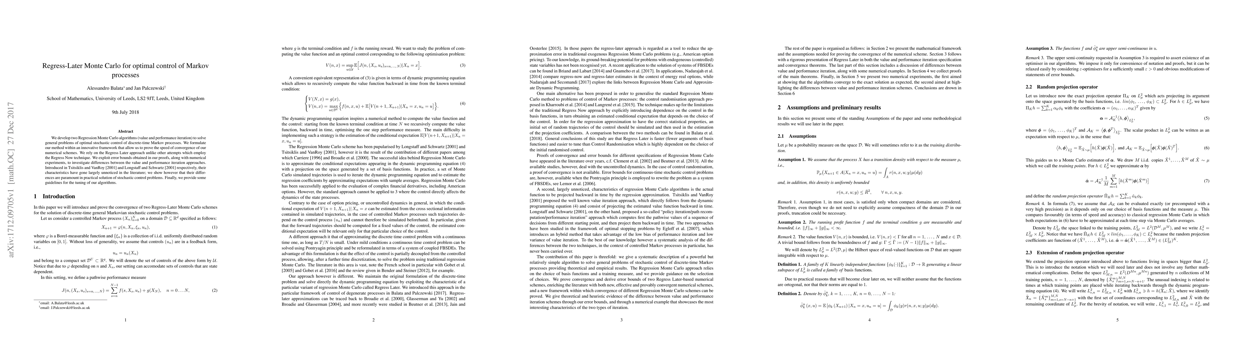 This paper introduces two Regression Monte Carlo algorithms for optimal control of discrete-time Markov processes, emphasizing the Regress Later approach. It highlights the differences between value and performance iteration methods and provides guidelines for algorithm tuning, supported by convergence proofs and numerical experiments.