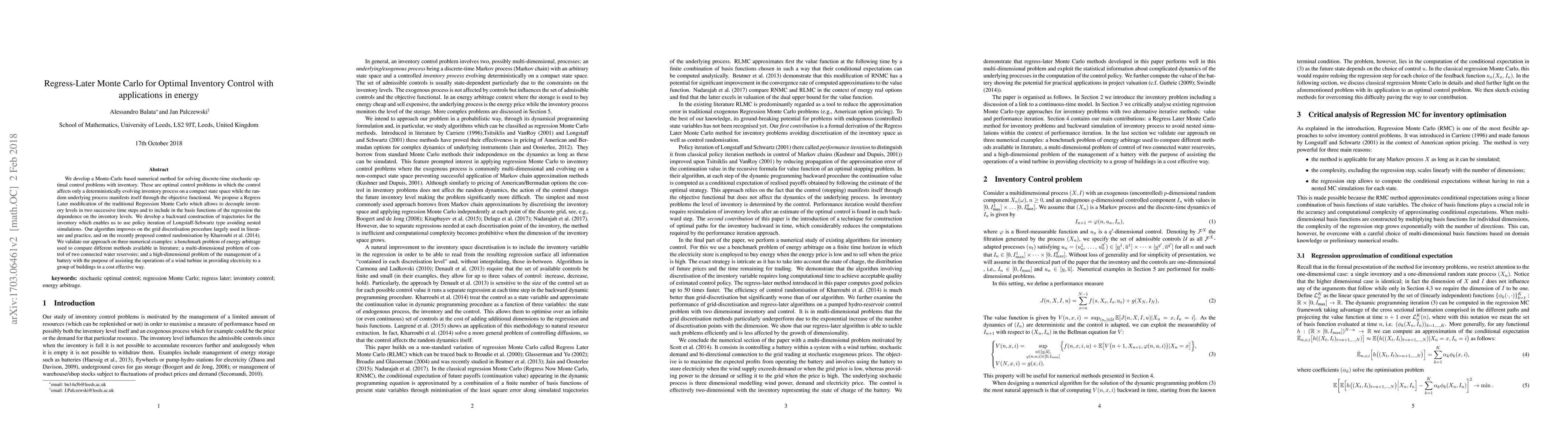 This paper introduces a Regress Later Monte Carlo method for solving discrete-time stochastic optimal control problems in inventory management, particularly applied to energy contexts. The proposed method decouples inventory levels and optimizes policy iteration, outperforming traditional grid discretization and control randomisation techniques.