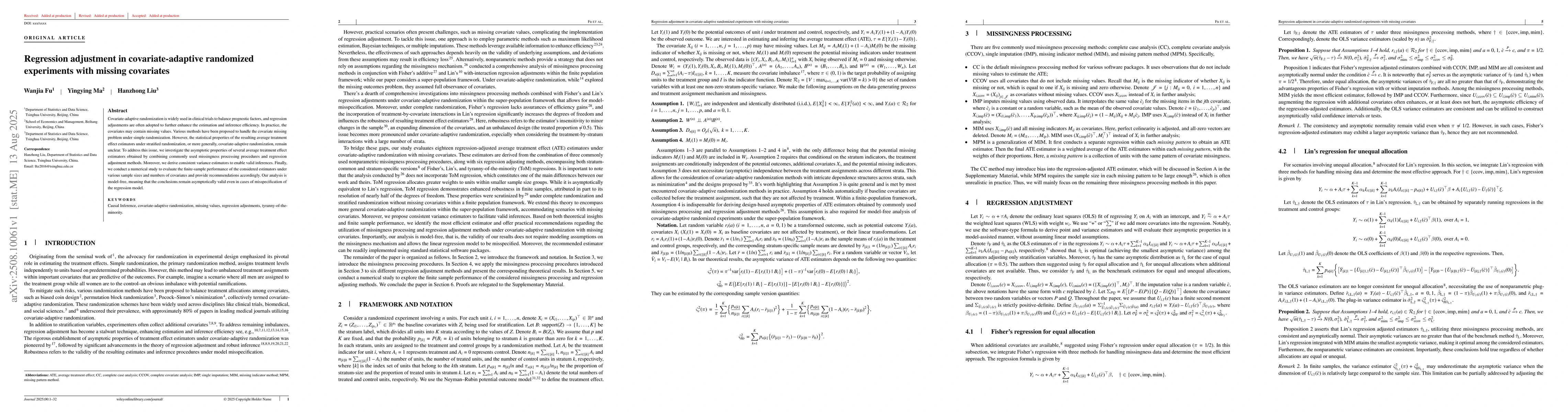 Covariate-adaptive randomization is widely used in clinical trials to balance prognostic factors, and regression adjustments are often adopted to further enhance the estimation and inference efficiency. In practice, the covariates may contain missing values. Various methods have been proposed to handle the covariate missing problem under simple randomization. However, the statistical properties of the resulting average treatment effect estimators under stratified randomization, or more generally, covariate-adaptive randomization, remain unclear. To address this issue, we investigate the asymptotic properties of several average treatment effect estimators obtained by combining commonly used missingness processing procedures and regression adjustment methods. Moreover, we derive consistent variance estimators to enable valid inferences. Finally, we conduct a numerical study to evaluate the finite-sample performance of the considered estimators under various sample sizes and numbers of covariates and provide recommendations accordingly. Our analysis is model-free, meaning that the conclusions remain asymptotically valid even in cases of misspecification of the regression model.