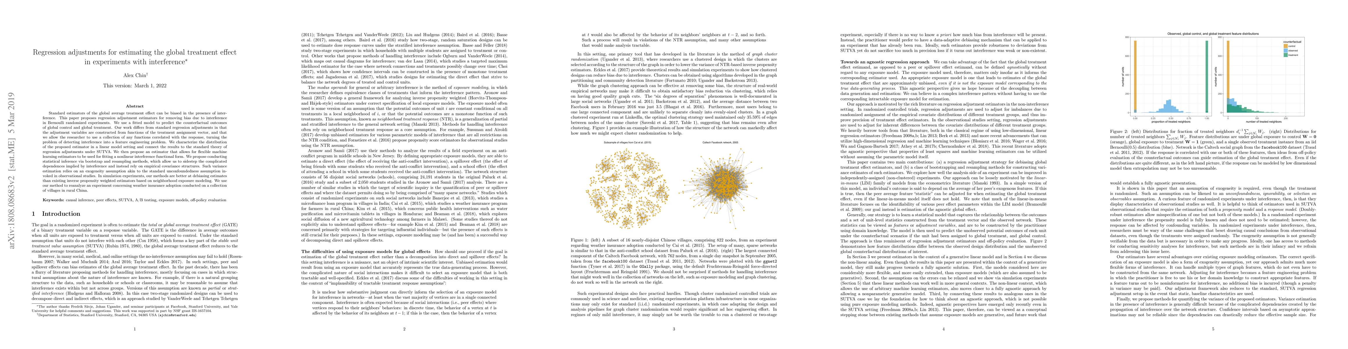 This paper proposes regression adjustment estimators to estimate the global treatment effect in experiments with interference, using fitted models to predict counterfactual outcomes. It introduces flexible machine learning methods for nonlinear interference and employs bootstrap resampling for statistical inference, demonstrating superior debiasing performance in simulations and a real-world application on weather insurance adoption in rural China.