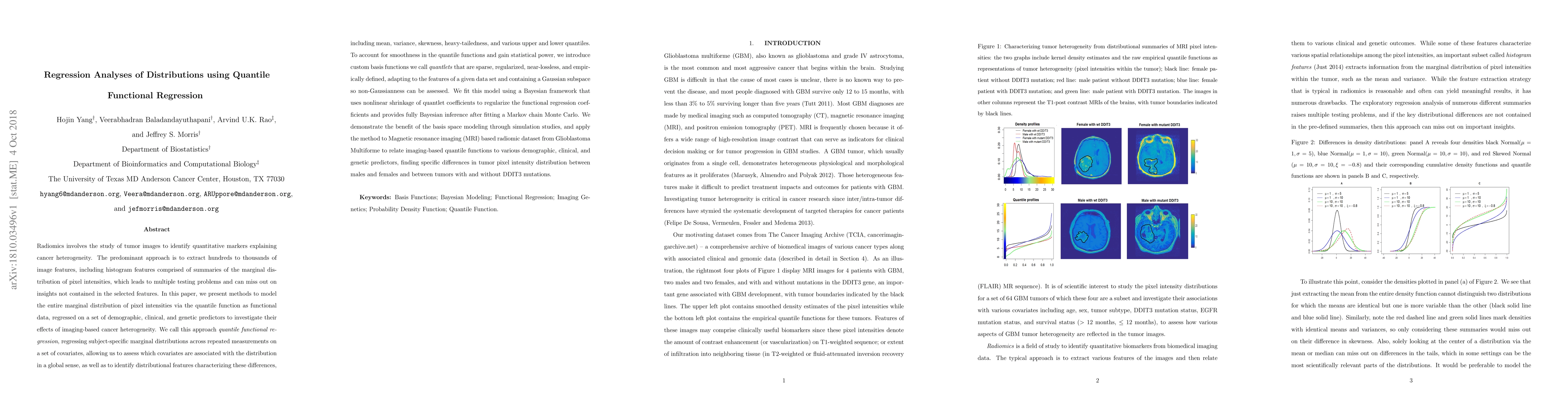 This paper introduces quantile functional regression to model the entire marginal distribution of pixel intensities in tumor images, using quantlets for smooth quantile function representation. The Bayesian framework with Markov chain Monte Carlo provides regularization and inference, demonstrating its effectiveness in analyzing MRI-based radiomic data from Glioblastoma Multiforme.