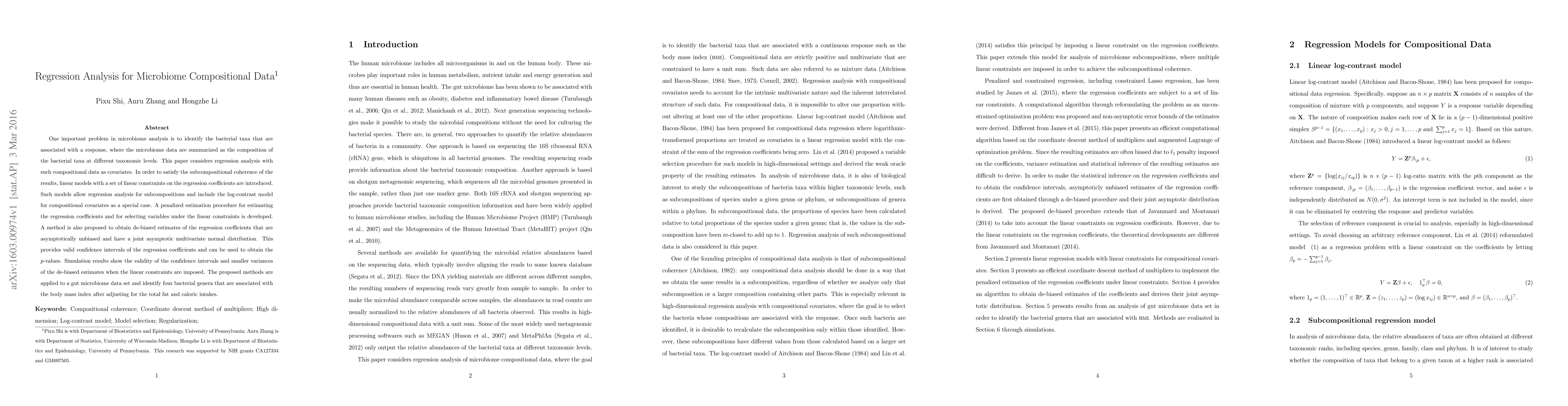 This paper introduces regression analysis methods for microbiome compositional data, using linear models with constraints to maintain subcompositional coherence. A penalized estimation procedure is developed for variable selection and de-biased coefficient estimation.