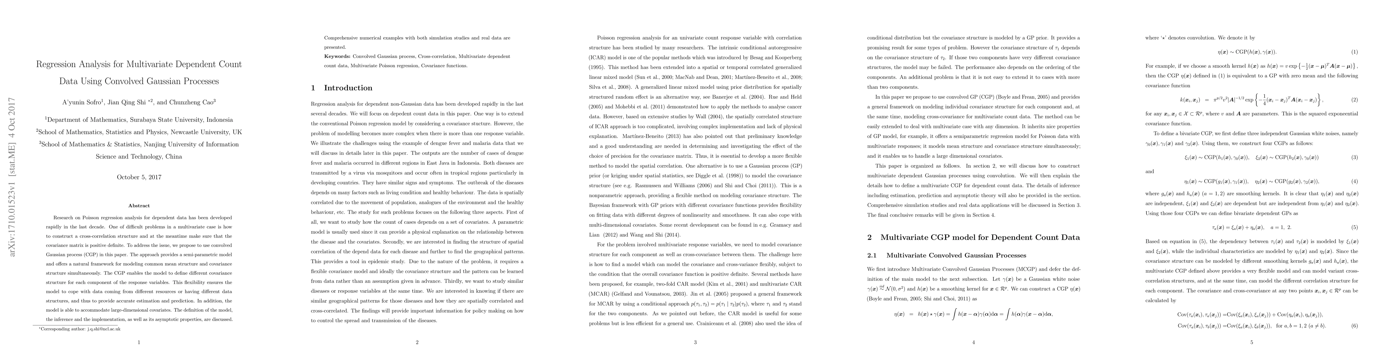 Research on Poisson regression analysis for dependent data has been developed rapidly in the last decade. One of difficult problems in a multivariate case is how to construct a cross-correlation structure and at the meantime make sure that the covariance matrix is positive definite. To address the issue, we propose to use convolved Gaussian process (CGP) in this paper. The approach provides a semi-parametric model and offers a natural framework for modeling common mean structure and covariance structure simultaneously. The CGP enables the model to define different covariance structure for each component of the response variables. This flexibility ensures the model to cope with data coming from different resources or having different data structures, and thus to provide accurate estimation and prediction. In addition, the model is able to accommodate large-dimensional covariates. The definition of the model, the inference and the implementation, as well as its asymptotic properties, are discussed. Comprehensive numerical examples with both simulation studies and real data are presented.
