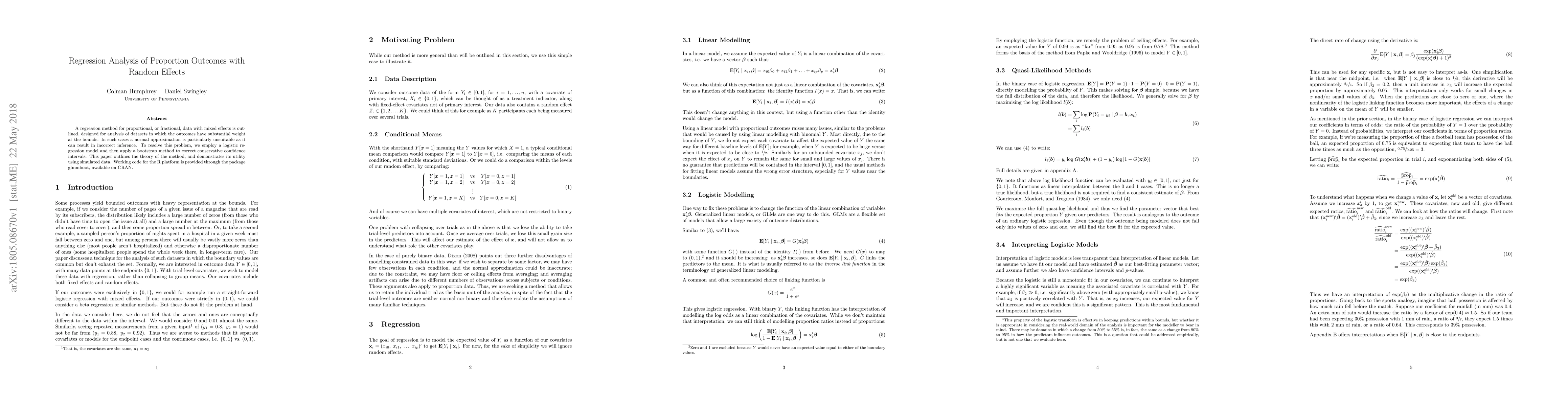 This paper presents a logistic regression method for analyzing proportional outcomes with mixed effects, addressing the limitations of normal approximations near data bounds. It employs a bootstrap technique to generate more accurate confidence intervals and provides R code via the glmmboot package for practical application.
