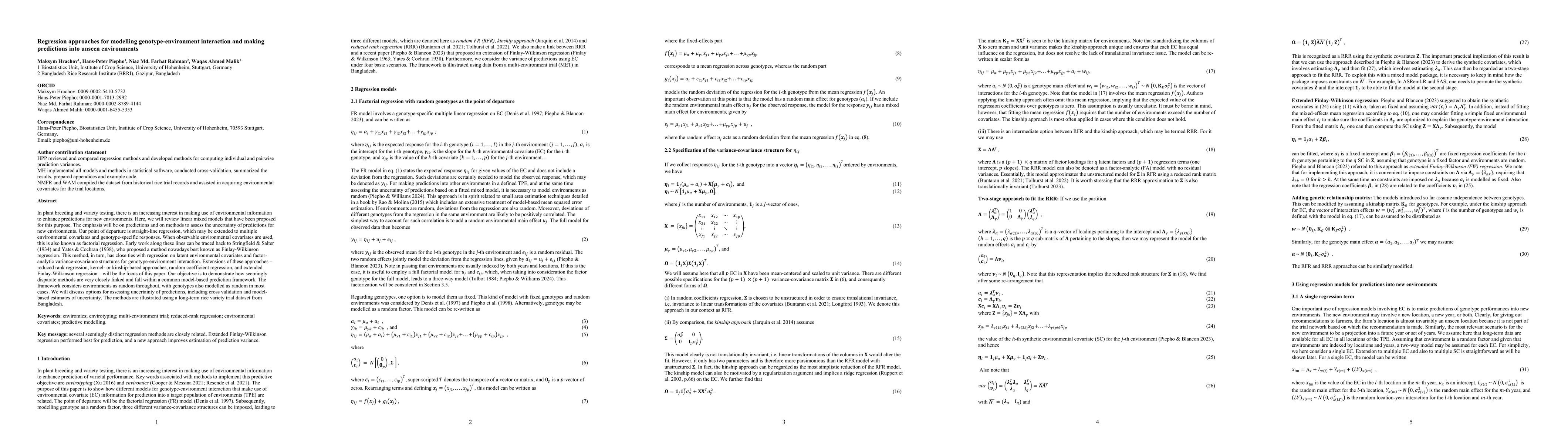 In plant breeding and variety testing, there is an increasing interest in making use of environmental information to enhance predictions for new environments. Here, we will review linear mixed models that have been proposed for this purpose. The emphasis will be on predictions and on methods to assess the uncertainty of predictions for new environments. Our point of departure is straight-line regression, which may be extended to multiple environmental covariates and genotype-specific responses. When observable environmental covariates are used, this is also known as factorial regression. Early work along these lines can be traced back to Stringfield & Salter (1934) and Yates & Cochran (1938), who proposed a method nowadays best known as Finlay-Wilkinson regression. This method, in turn, has close ties with regression on latent environmental covariates and factor-analytic variance-covariance structures for genotype-environment interaction. Extensions of these approaches - reduced rank regression, kernel- or kinship-based approaches, random coefficient regression, and extended Finlay-Wilkinson regression - will be the focus of this paper. Our objective is to demonstrate how seemingly disparate methods are very closely linked and fall within a common model-based prediction framework. The framework considers environments as random throughout, with genotypes also modelled as random in most cases. We will discuss options for assessing uncertainty of predictions, including cross validation and model-based estimates of uncertainty. The methods are illustrated using a long-term rice variety trial dataset from Bangladesh.