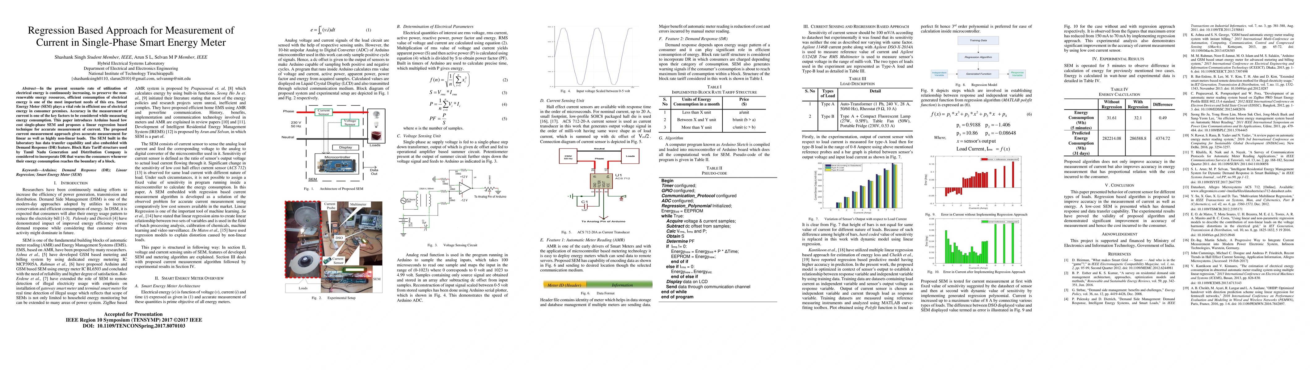 This paper proposes a low-cost single-phase smart energy meter using Arduino that accurately measures current using linear regression, suitable for both linear and non-linear loads.