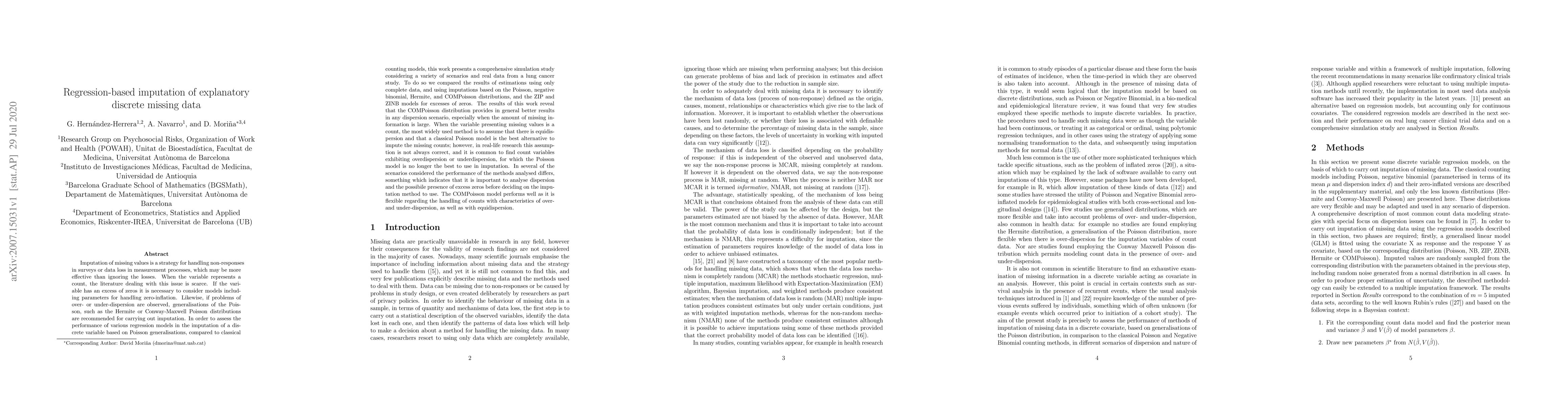 Imputation of missing values is a strategy for handling non-responses in surveys or data loss in measurement processes, which may be more effective than ignoring them. When the variable represents a count, the literature dealing with this issue is scarce. Likewise, if problems of over- or under-dispersion are observed, generalisations of the Poisson distribution are recommended for carrying out imputation. In order to assess the performance of various regression models in the imputation of a discrete variable compared to classical counting models, this work presents a comprehensive simulation study considering a variety of scenarios and real data. To do so we compared the results of estimations using only complete data, and using imputations based on the Poisson, negative binomial, Hermite, and COMPoisson distributions, and the ZIP and ZINB models for excesses of zeros. The results of this work reveal that the COMPoisson distribution provides in general better results in any dispersion scenario, especially when the amount of missing information is large. When the variable presenting missing values is a count, the most widely used method is to assume that a classical Poisson model is the best alternative to impute the missing counts; however, in real-life research this assumption is not always correct, and it is common to find count variables exhibiting overdispersion or underdispersion, for which the Poisson model is no longer the best to use in imputation. In several of the scenarios considered the performance of the methods analysed differs, something which indicates that it is important to analyse dispersion and the possible presence of excess zeros before deciding on the imputation method to use. The COMPoisson model performs well as it is flexible regarding the handling of counts with characteristics of over- and under-dispersion, as well as with equidispersion.