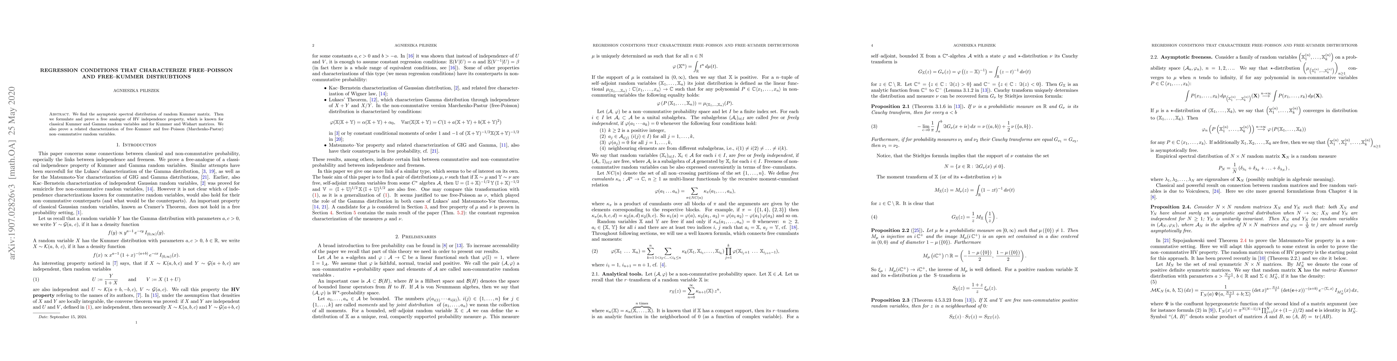 This paper investigates the asymptotic spectral distribution of random Kummer matrices and establishes a free analogue of the HV independence property for non-commutative random variables. It also characterizes free-Kummer and free-Poisson distributions through a new characterization theorem.