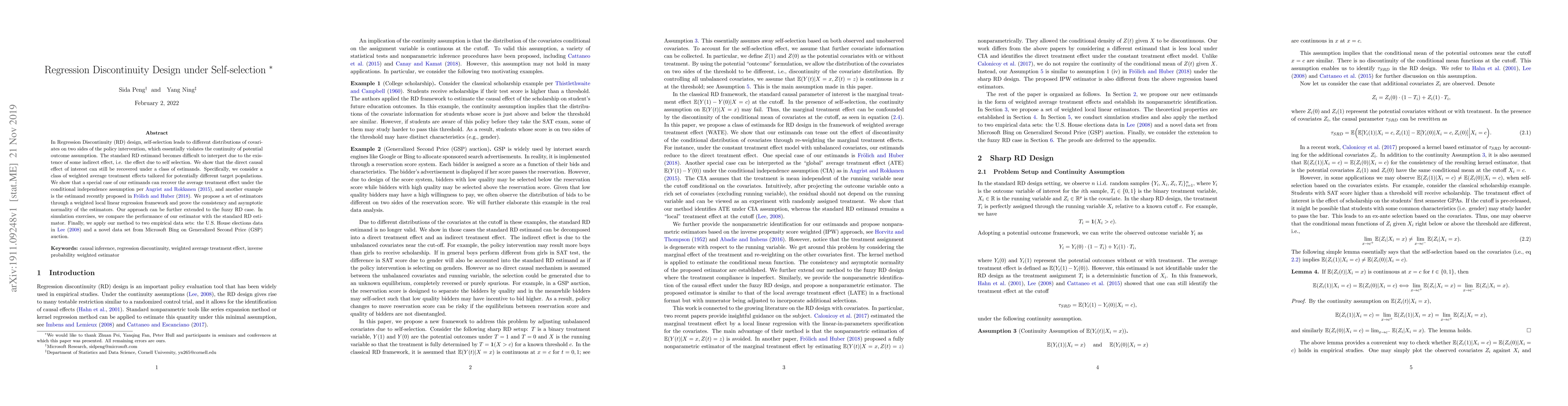 This paper addresses the challenge of self-selection in Regression Discontinuity (RD) designs, proposing new weighted average treatment effect estimators that recover the direct causal effect despite covariate distribution discrepancies. The authors demonstrate the consistency and asymptotic normality of their estimators and show their applicability to both sharp and fuzzy RD settings.