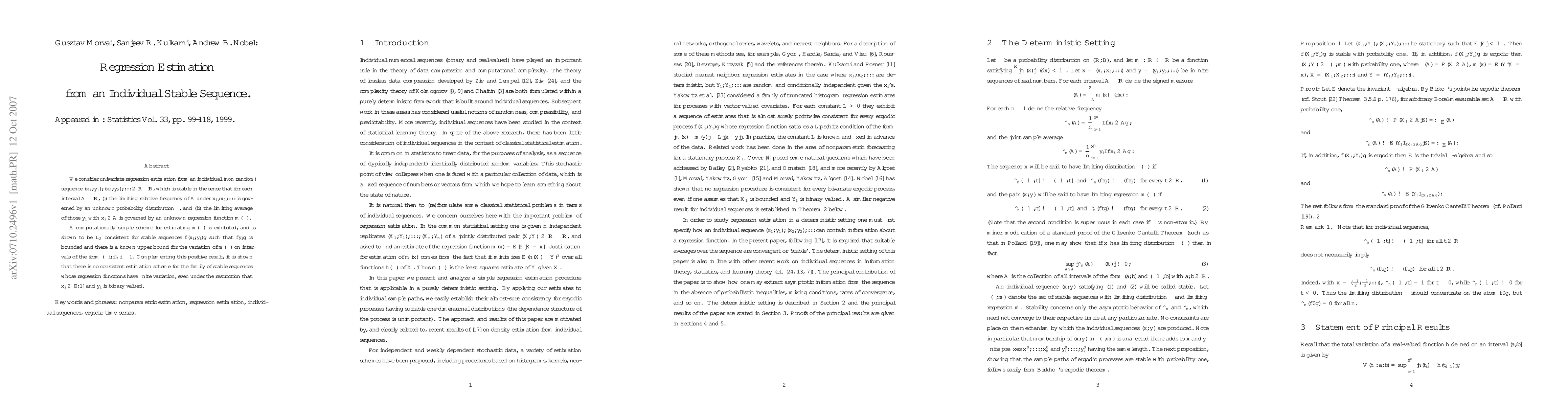 We consider univariate regression estimation from an individual (non-random) sequence $(x_1,y_1),(x_2,y_2), ... \in \real \times \real$, which is stable in the sense that for each interval $A \subseteq \real$, (i) the limiting relative frequency of $A$ under $x_1, x_2, ...$ is governed by an unknown probability distribution $\mu$, and (ii) the limiting average of those $y_i$ with $x_i \in A$ is governed by an unknown regression function $m(\cdot)$. A computationally simple scheme for estimating $m(\cdot)$ is exhibited, and is shown to be $L_2$ consistent for stable sequences $\{(x_i,y_i)\}$ such that $\{y_i\}$ is bounded and there is a known upper bound for the variation of $m(\cdot)$ on intervals of the form $(-i,i]$, $i \geq 1$. Complementing this positive result, it is shown that there is no consistent estimation scheme for the family of stable sequences whose regression functions have finite variation, even under the restriction that $x_i \in [0,1]$ and $y_i$ is binary-valued.