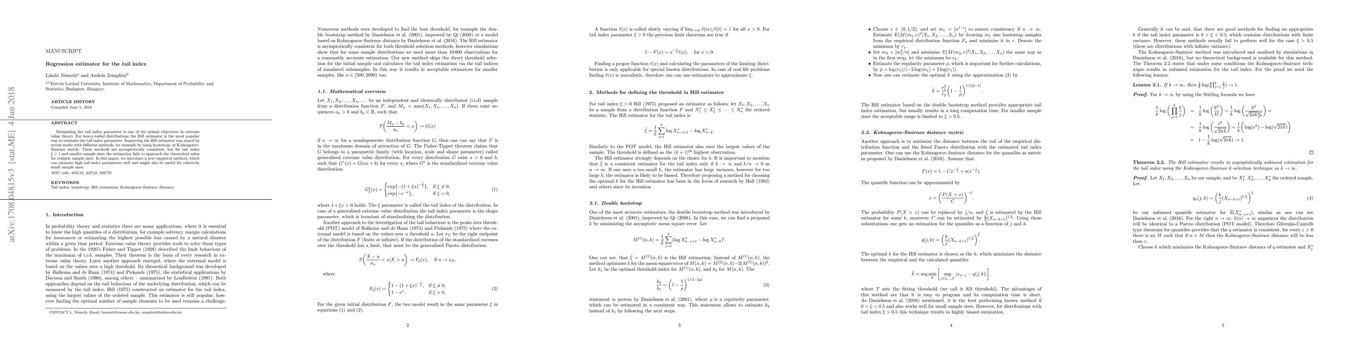 This paper proposes a new empirical regression estimator for accurately estimating high tail index parameters, especially for heavy-tailed distributions and smaller sample sizes, where traditional methods like the Hill estimator fail. The method aims to improve estimation accuracy for tail index values greater than 1.