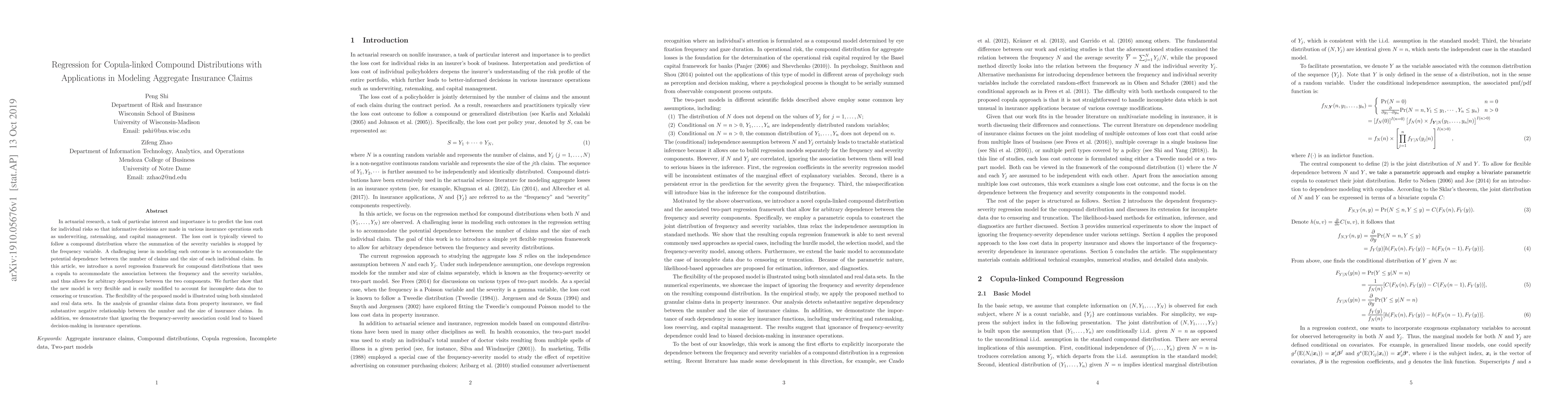 This paper presents a novel regression framework using copulas to model compound distributions for aggregate insurance claims, addressing the dependence between claim frequency and size. The proposed model is flexible and can handle incomplete data, demonstrating its effectiveness through both simulated and real property insurance data.