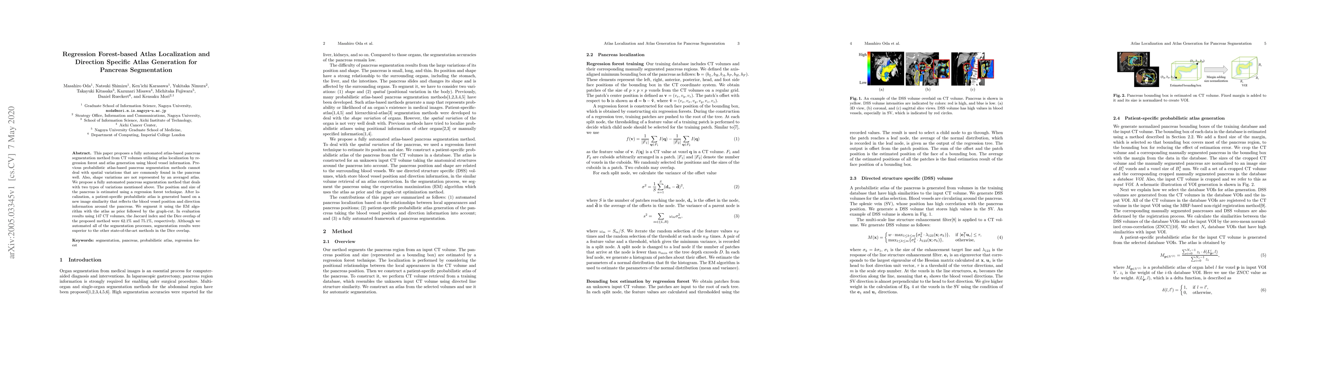This paper presents an automated pancreas segmentation method using regression forest for localization and a direction-specific atlas generated from blood vessel information. The method outperforms existing techniques by better handling spatial and shape variations, achieving a Dice overlap of 75.1% in evaluations.