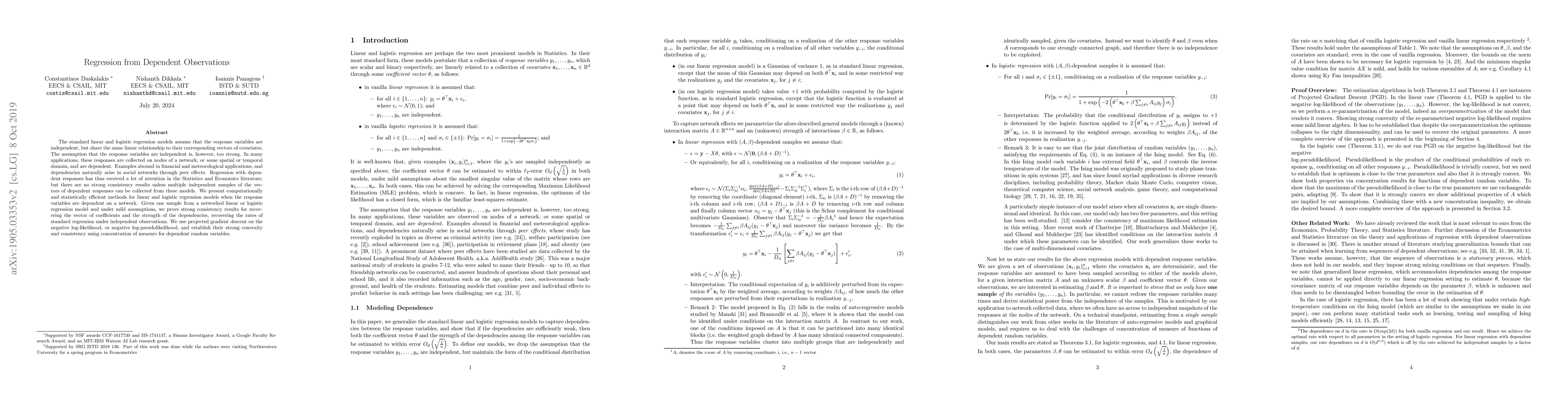 The standard linear and logistic regression models assume that the response variables are independent, but share the same linear relationship to their corresponding vectors of covariates. The assumption that the response variables are independent is, however, too strong. In many applications, these responses are collected on nodes of a network, or some spatial or temporal domain, and are dependent. Examples abound in financial and meteorological applications, and dependencies naturally arise in social networks through peer effects. Regression with dependent responses has thus received a lot of attention in the Statistics and Economics literature, but there are no strong consistency results unless multiple independent samples of the vectors of dependent responses can be collected from these models. We present computationally and statistically efficient methods for linear and logistic regression models when the response variables are dependent on a network. Given one sample from a networked linear or logistic regression model and under mild assumptions, we prove strong consistency results for recovering the vector of coefficients and the strength of the dependencies, recovering the rates of standard regression under independent observations. We use projected gradient descent on the negative log-likelihood, or negative log-pseudolikelihood, and establish their strong convexity and consistency using concentration of measure for dependent random variables.