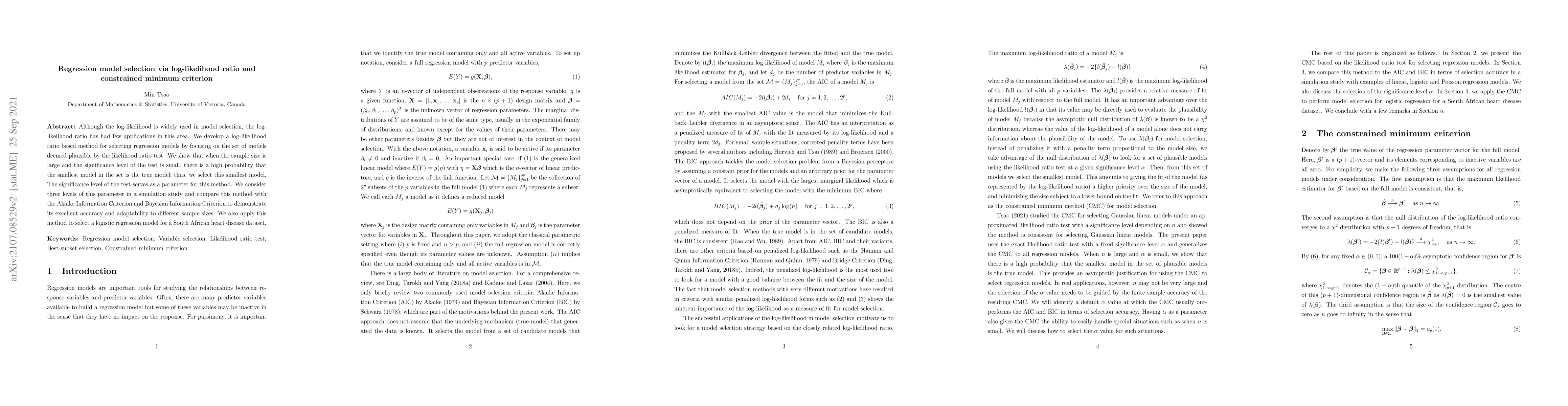 This paper proposes a new method for selecting regression models using the log-likelihood ratio test, demonstrating high accuracy and adaptability by comparing it to the Akaike and Bayesian Information Criteria in simulations and real-world data. The method selects the smallest plausible model when sample size is large and the significance level is small.