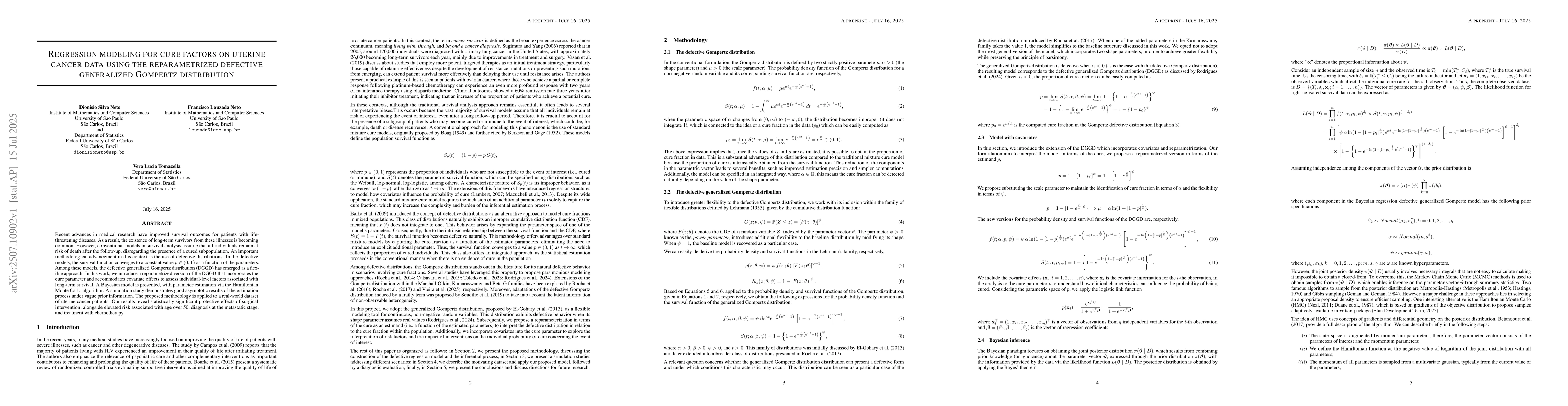Recent advances in medical research have improved survival outcomes for patients with life-threatening diseases. As a result, the existence of long-term survivors from these illnesses is becoming common. However, conventional models in survival analysis assume that all individuals remain at risk of death after the follow-up, disregarding the presence of a cured subpopulation. An important methodological advancement in this context is the use of defective distributions. In the defective models, the survival function converges to a constant value $p \in (0,1)$ as a function of the parameters. Among these models, the defective generalized Gompertz distribution (DGGD) has emerged as a flexible approach. In this work, we introduce a reparametrized version of the DGGD that incorporates the cure parameter and accommodates covariate effects to assess individual-level factors associated with long-term survival. A Bayesian model is presented, with parameter estimation via the Hamiltonian Monte Carlo algorithm. A simulation study demonstrates good asymptotic results of the estimation process under vague prior information. The proposed methodology is applied to a real-world dataset of uterine cancer patients. Our results reveal statistically significant protective effects of surgical intervention, alongside elevated risk associated with age over 50, diagnosis at the metastatic stage, and treatment with chemotherapy.