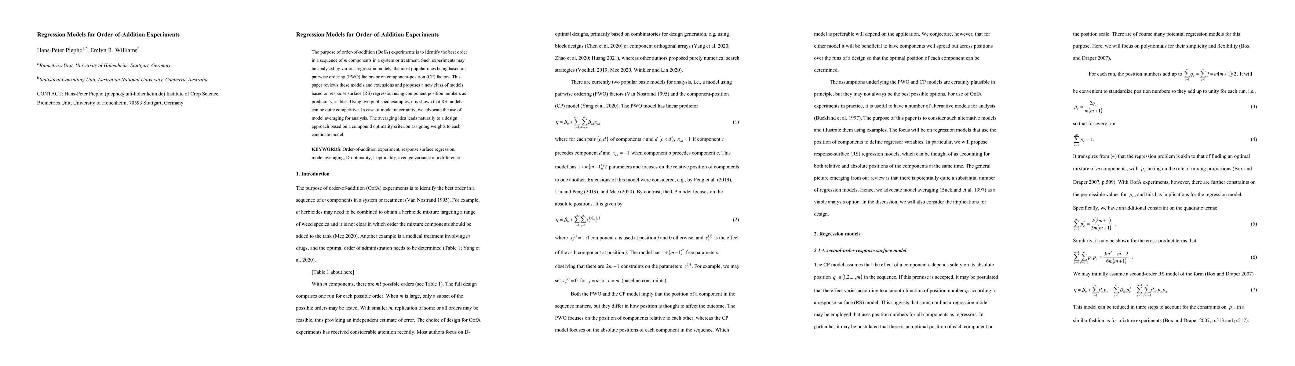 The purpose of order-of-addition (OofA) experiments is to identify the best order in a sequence of m components in a system or treatment. Such experiments may be analysed by various regression models, the most popular ones being based on pairwise ordering (PWO) factors or on component-position (CP) factors. This paper reviews these models and extensions and proposes a new class of models based on response surface (RS) regression using component position numbers as predictor variables. Using two published examples, it is shown that RS models can be quite competitive. In case of model uncertainty, we advocate the use of model averaging for analysis. The averaging idea leads naturally to a design approach based on a compound optimality criterion assigning weights to each candidate model.