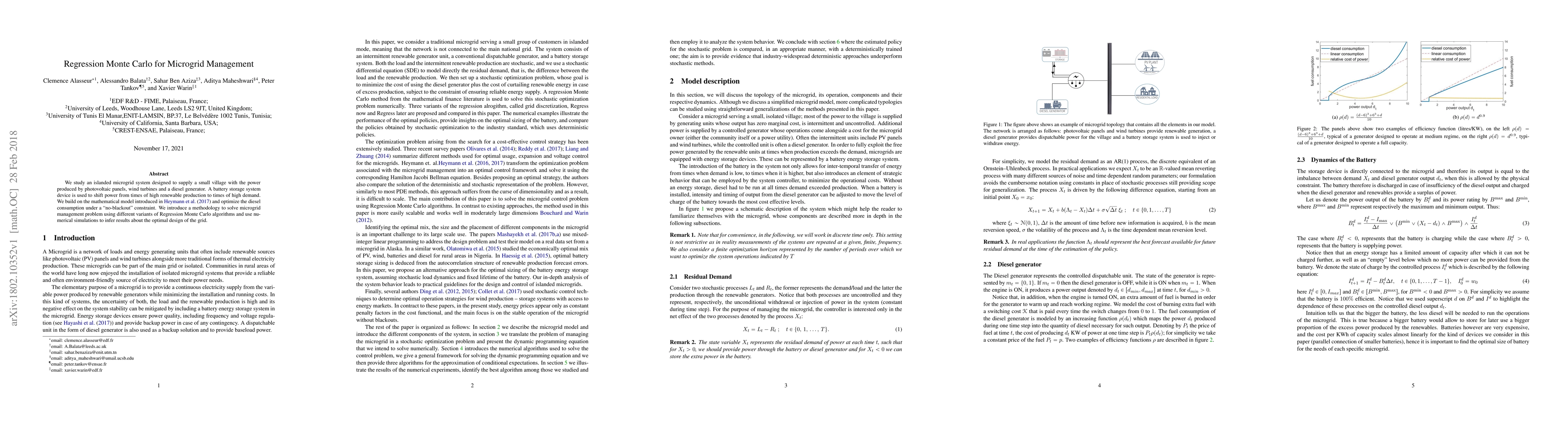 We study an islanded microgrid system designed to supply a small village with the power produced by photovoltaic panels, wind turbines and a diesel generator. A battery storage system device is used to shift power from times of high renewable production to times of high demand. We introduce a methodology to solve microgrid management problem using different variants of Regression Monte Carlo algorithms and use numerical simulations to infer results about the optimal design of the grid.