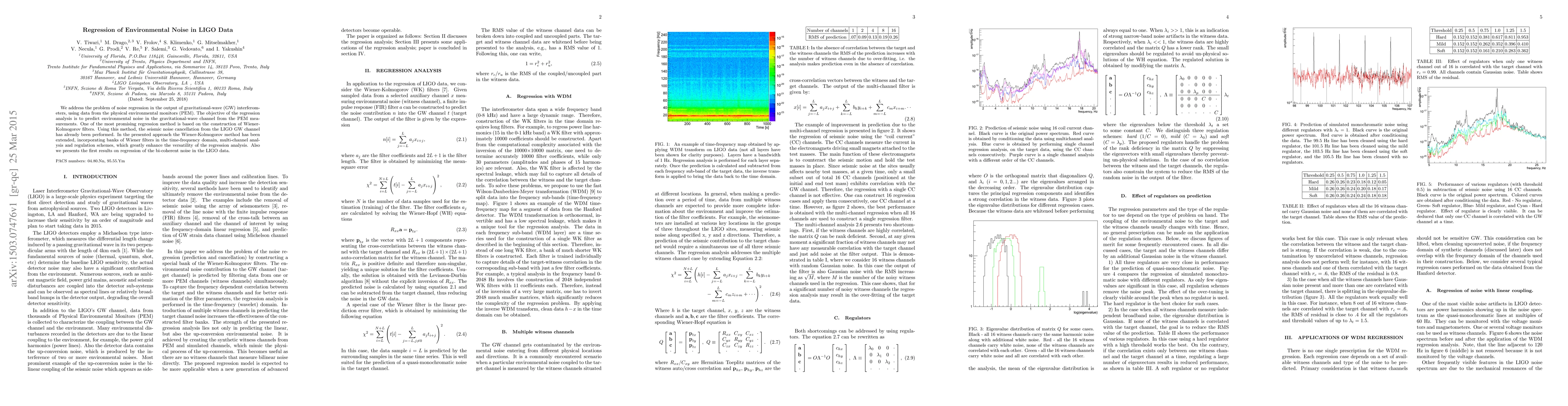 We address the problem of noise regression in the output of gravitational-wave (GW) interferometers, using data from the physical environmental monitors (PEM). The objective of the regression analysis is to predict environmental noise in the gravitational-wave channel from the PEM measurements. One of the most promising regression method is based on the construction of Wiener-Kolmogorov filters. Using this method, the seismic noise cancellation from the LIGO GW channel has already been performed. In the presented approach the Wiener-Kolmogorov method has been extended, incorporating banks of Wiener filters in the time-frequency domain, multi-channel analysis and regulation schemes, which greatly enhance the versatility of the regression analysis. Also we presents the first results on regression of the bi-coherent noise in the LIGO data.