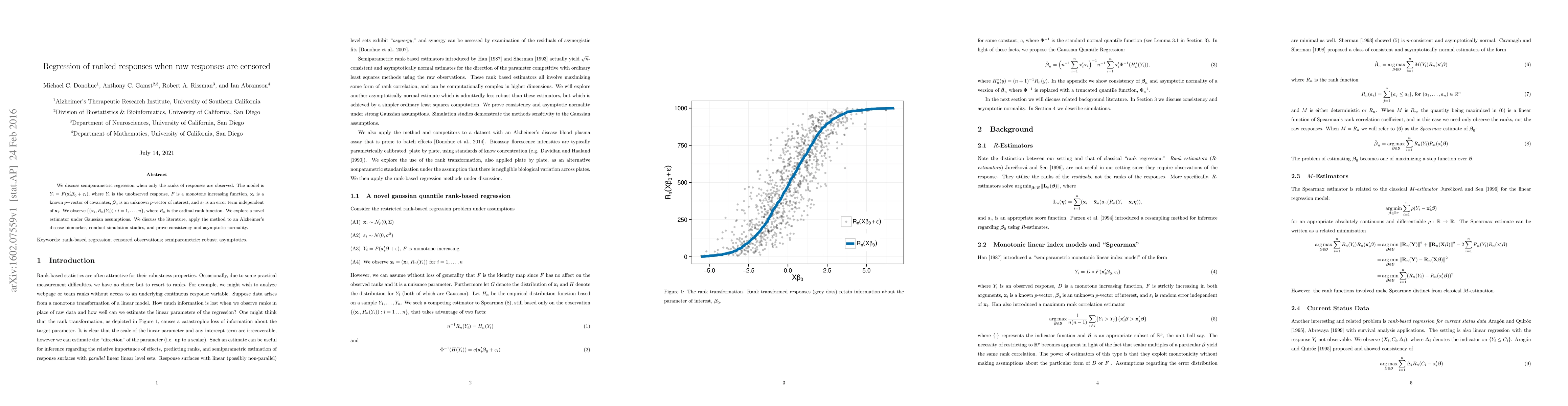 We discuss semiparametric regression when only the ranks of responses are observed. The model is $Y_i = F (\mathbf{x}_i'{\boldsymbol\beta}_0 + \varepsilon_i)$, where $Y_i$ is the unobserved response, $F$ is a monotone increasing function, $\mathbf{x}_i$ is a known $p-$vector of covariates, ${\boldsymbol\beta}_0$ is an unknown $p$-vector of interest, and $\varepsilon_i$ is an error term independent of $\mathbf{x}_i$. We observe $\{(\mathbf{x}_i,R_n(Y_i)) : i = 1,\ldots ,n\}$, where $R_n$ is the ordinal rank function. We explore a novel estimator under Gaussian assumptions. We discuss the literature, apply the method to an Alzheimer's disease biomarker, conduct simulation studies, and prove consistency and asymptotic normality.