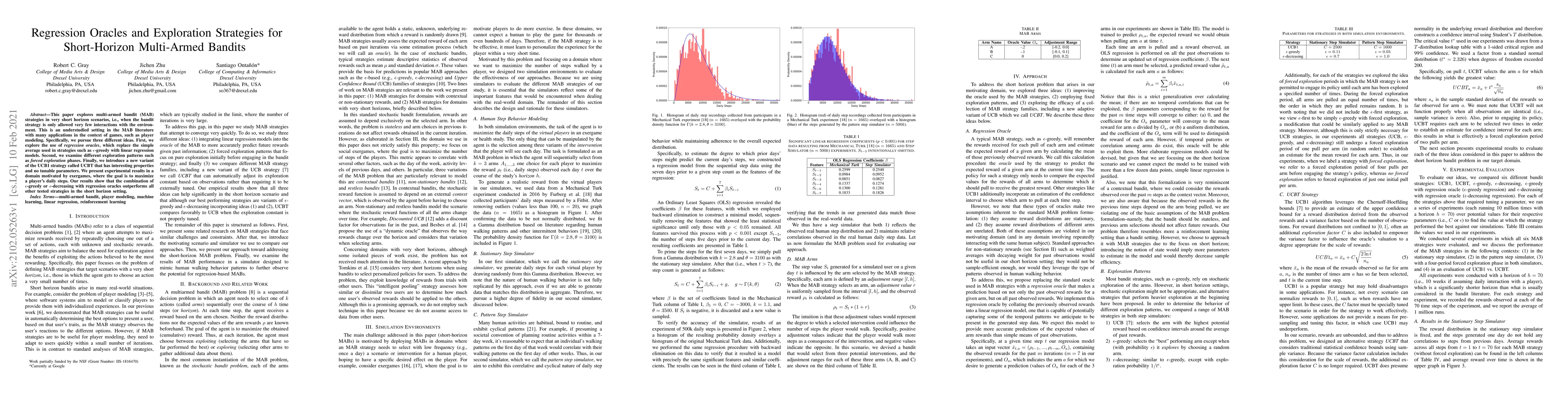 This paper explores multi-armed bandit (MAB) strategies in very short horizon scenarios, i.e., when the bandit strategy is only allowed very few interactions with the environment. This is an understudied setting in the MAB literature with many applications in the context of games, such as player modeling. Specifically, we pursue three different ideas. First, we explore the use of regression oracles, which replace the simple average used in strategies such as epsilon-greedy with linear regression models. Second, we examine different exploration patterns such as forced exploration phases. Finally, we introduce a new variant of the UCB1 strategy called UCBT that has interesting properties and no tunable parameters. We present experimental results in a domain motivated by exergames, where the goal is to maximize a player's daily steps. Our results show that the combination of epsilon-greedy or epsilon-decreasing with regression oracles outperforms all other tested strategies in the short horizon setting.