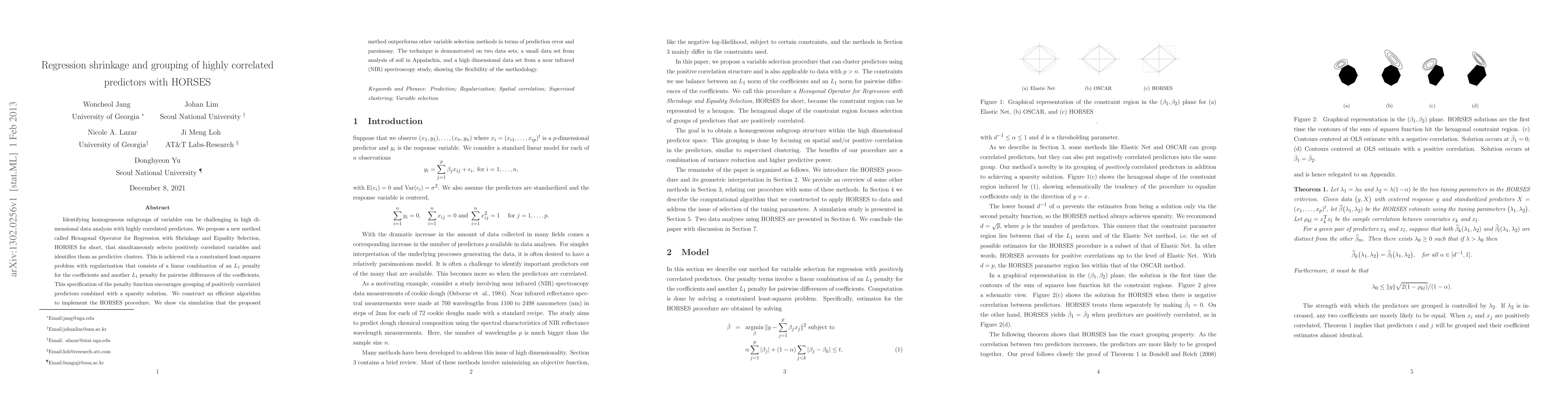 The paper introduces HORSES, a new method for regression that groups highly correlated predictors into homogeneous subgroups, using a constrained least-squares problem with regularization. The method outperforms other variable selection techniques in prediction accuracy and parsimony, as demonstrated through simulations and applications to soil and spectroscopy datasets.