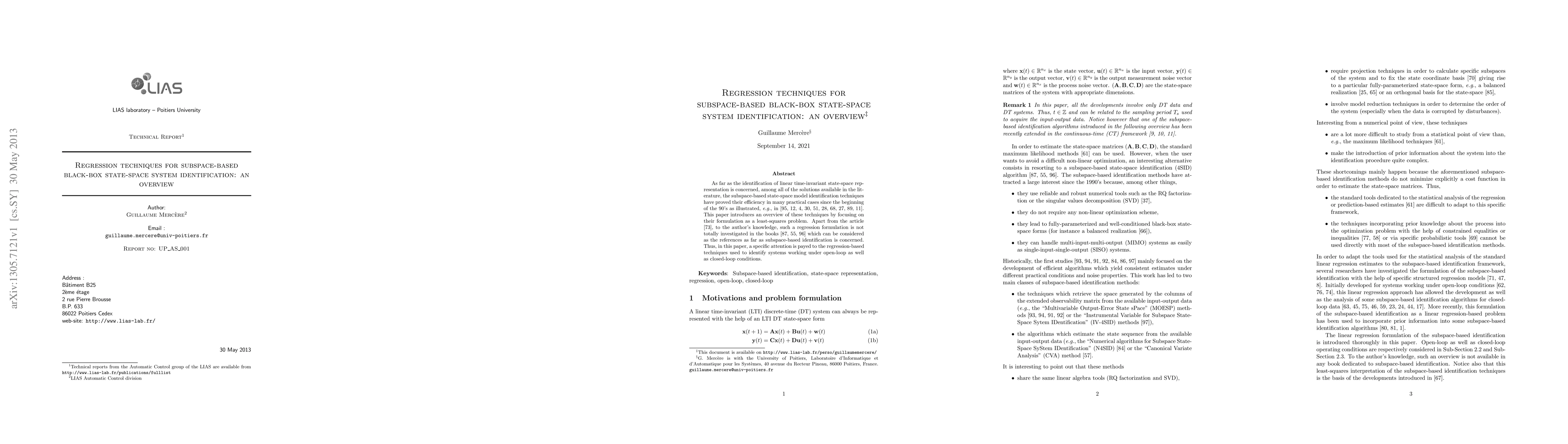 This paper provides an overview of subspace-based state-space model identification techniques, emphasizing their regression formulation as least-squares problems. It highlights the efficiency of these methods in practical applications, particularly under open-loop and closed-loop conditions.