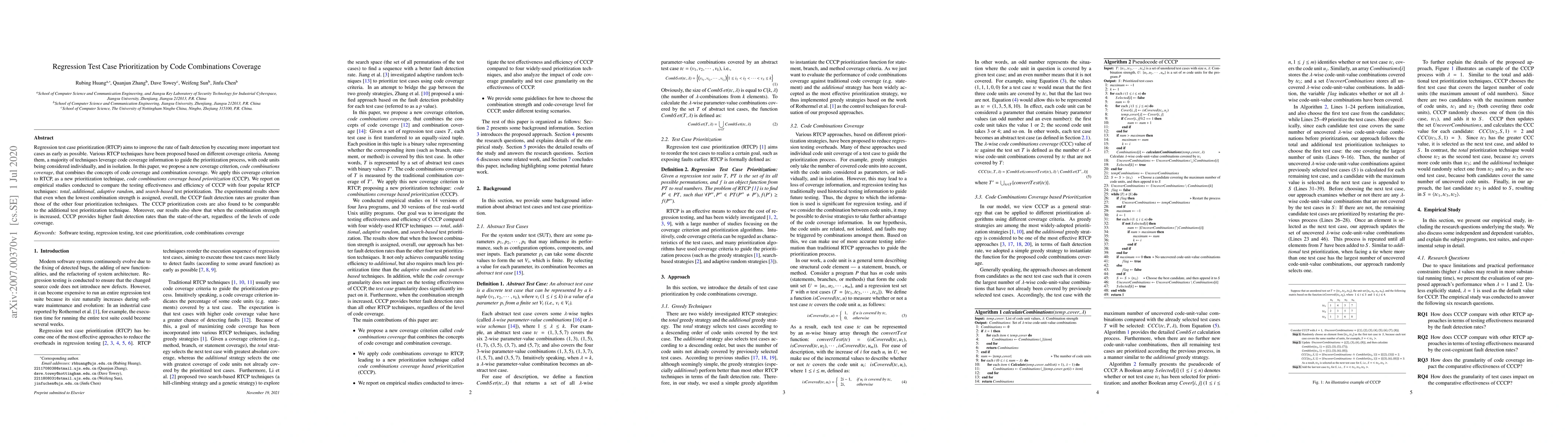 This paper proposes a new regression test case prioritization technique called code combinations coverage based prioritization (CCCP), which uses a combination of code coverage and combination coverage to prioritize test cases. Experimental results show that CCCP achieves higher fault detection rates compared to other prioritization techniques, with comparable costs.