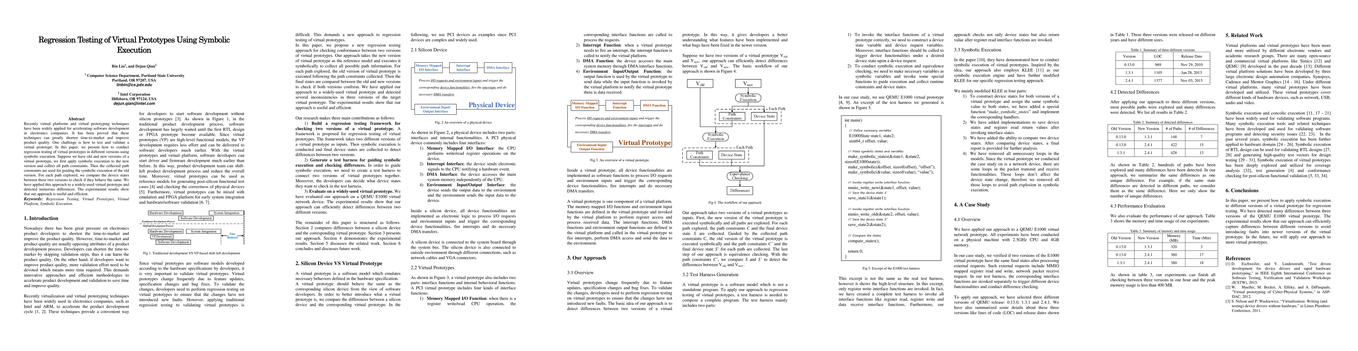 This paper proposes a method for regression testing virtual prototypes using symbolic execution, comparing device states between old and new versions to detect differences. The approach involves applying symbolic execution to the new version and using collected path constraints to guide the old version's execution, demonstrating its effectiveness and efficiency through practical application.
