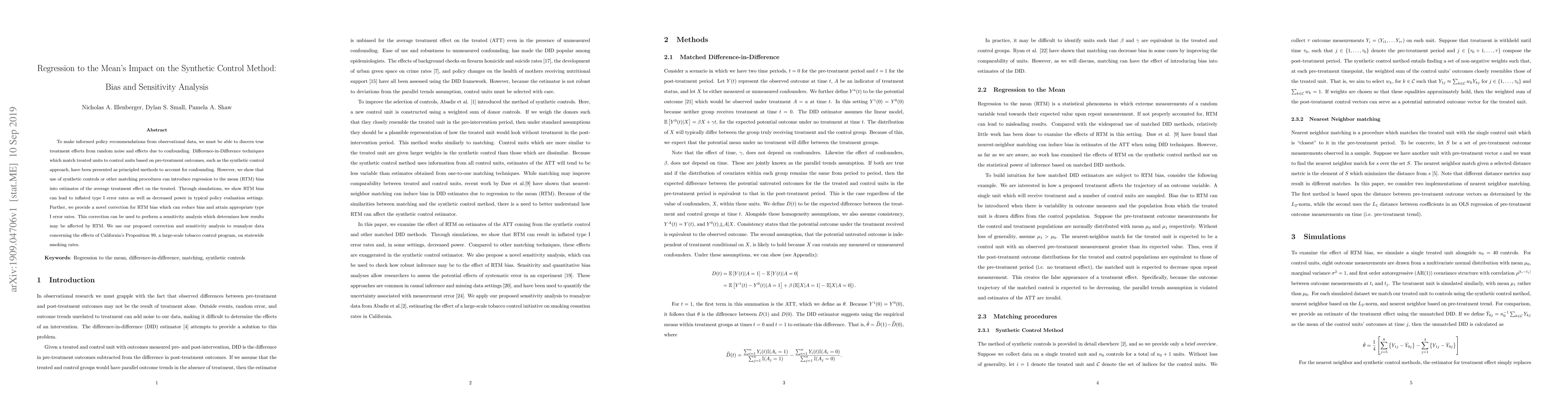 To make informed policy recommendations from observational data, we must be able to discern true treatment effects from random noise and effects due to confounding. Difference-in-Difference techniques which match treated units to control units based on pre-treatment outcomes, such as the synthetic control approach have been presented as principled methods to account for confounding. However, we show that use of synthetic controls or other matching procedures can introduce regression to the mean (RTM) bias into estimates of the average treatment effect on the treated. Through simulations, we show RTM bias can lead to inflated type I error rates as well as decreased power in typical policy evaluation settings. Further, we provide a novel correction for RTM bias which can reduce bias and attain appropriate type I error rates. This correction can be used to perform a sensitivity analysis which determines how results may be affected by RTM. We use our proposed correction and sensitivity analysis to reanalyze data concerning the effects of California's Proposition 99, a large-scale tobacco control program, on statewide smoking rates.