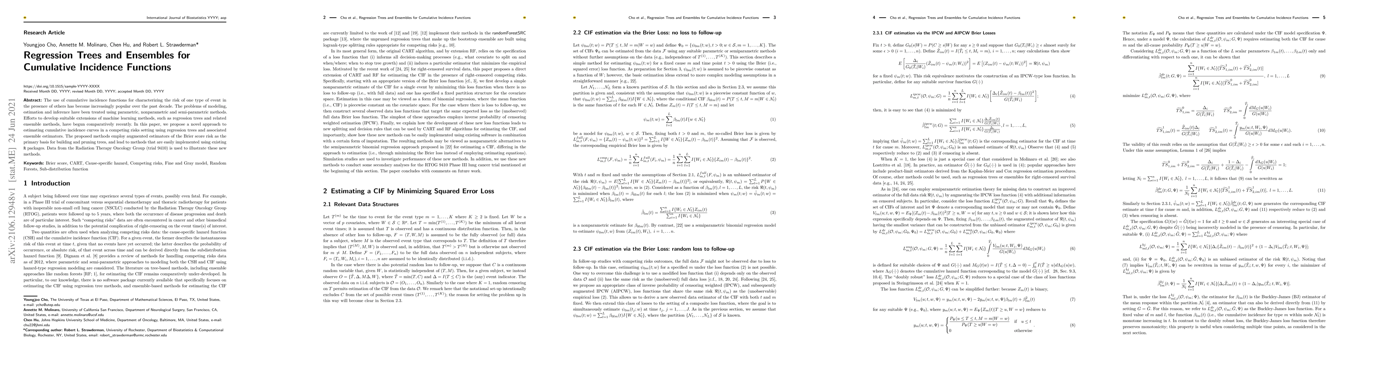 This paper proposes a novel approach to estimating cumulative incidence curves using regression trees and ensemble methods in competing risks settings. The methods utilize augmented estimators of the Brier score risk for tree building and pruning, and are demonstrated using data from the Radiation Therapy Oncology Group trial 9410.