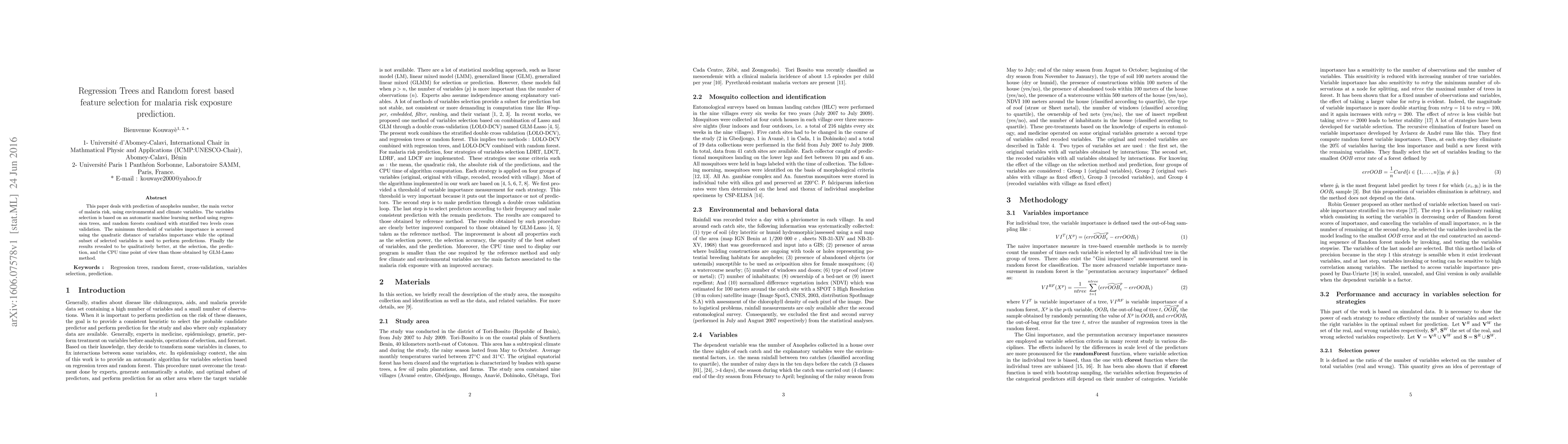 Researchers used regression trees and random forests to select variables for predicting malaria risk, achieving better results than a comparable method in terms of accuracy and CPU time.
