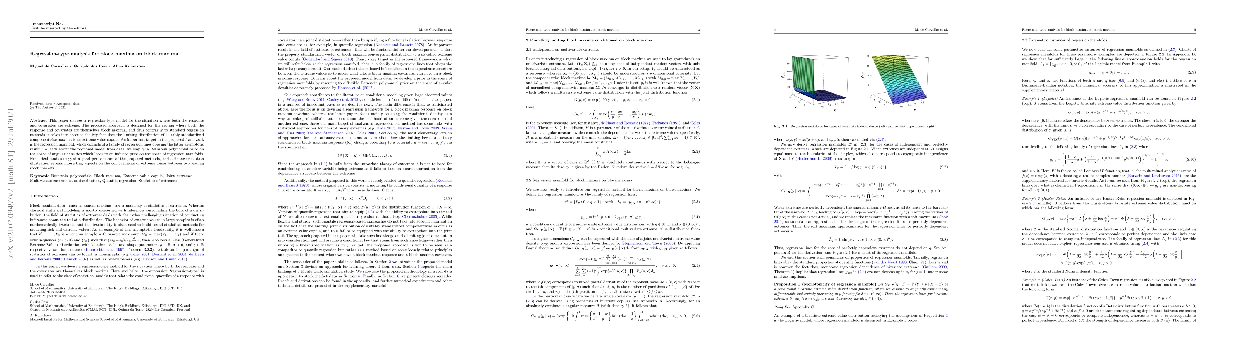 This paper proposes a regression-type model for analyzing extreme values where both the response and covariates are block maxima, utilizing an extreme value copula to account for their joint limiting distribution. The model employs a Bernstein polynomial prior to infer the regression manifold, demonstrating effective performance through numerical studies and a financial application illustrating extreme comovements in stock markets.