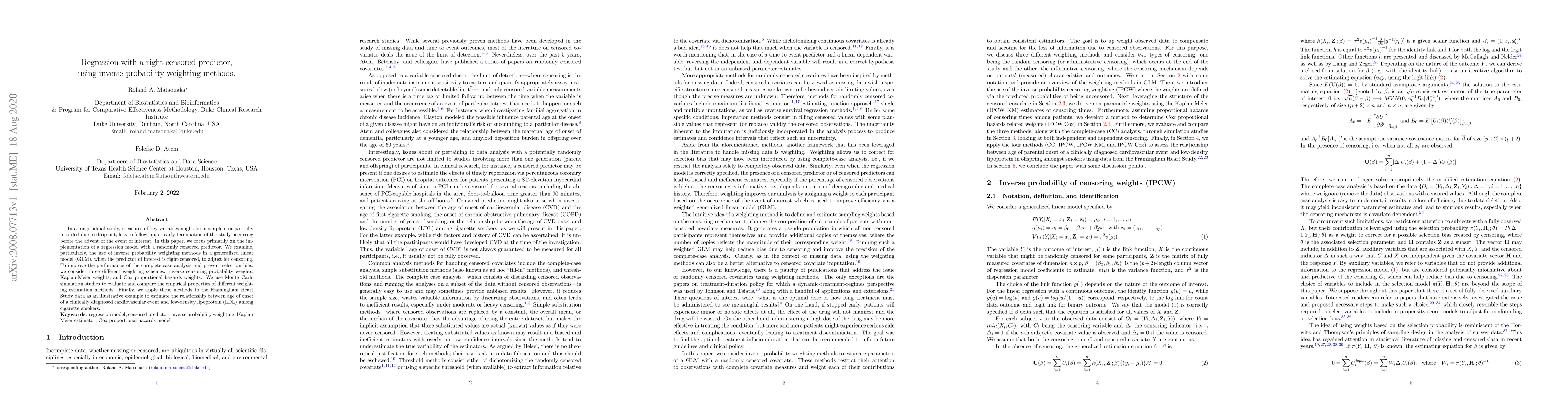 This paper explores regression models for predictors that are right-censored due to incomplete data in longitudinal studies, employing inverse probability weighting methods within a generalized linear model framework. It evaluates three weighting schemes—inverse censoring, Kaplan-Meier, and Cox proportional hazards—using Monte Carlo simulations and applies them to the Framingham Heart Study data to assess cardiovascular event onset in smokers.