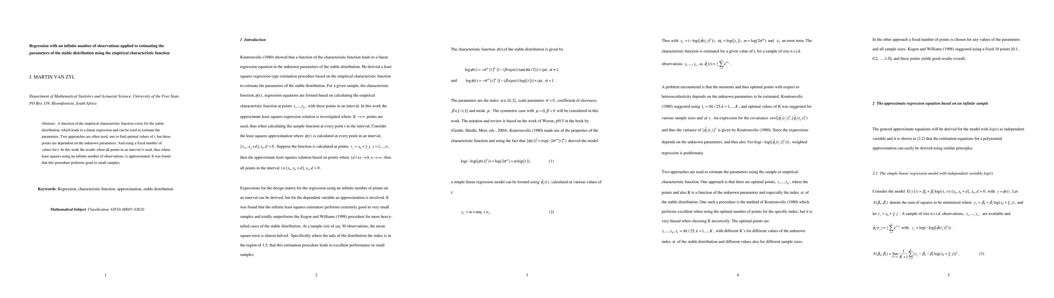 This paper explores estimating the parameters of a stable distribution using the empirical characteristic function through linear regression. It compares two methods: one that finds optimal values of t, and another that uses a fixed number of t values. The study finds that using all points in an interval, approximating least squares with an infinite number of observations, performs well even in small samples.
