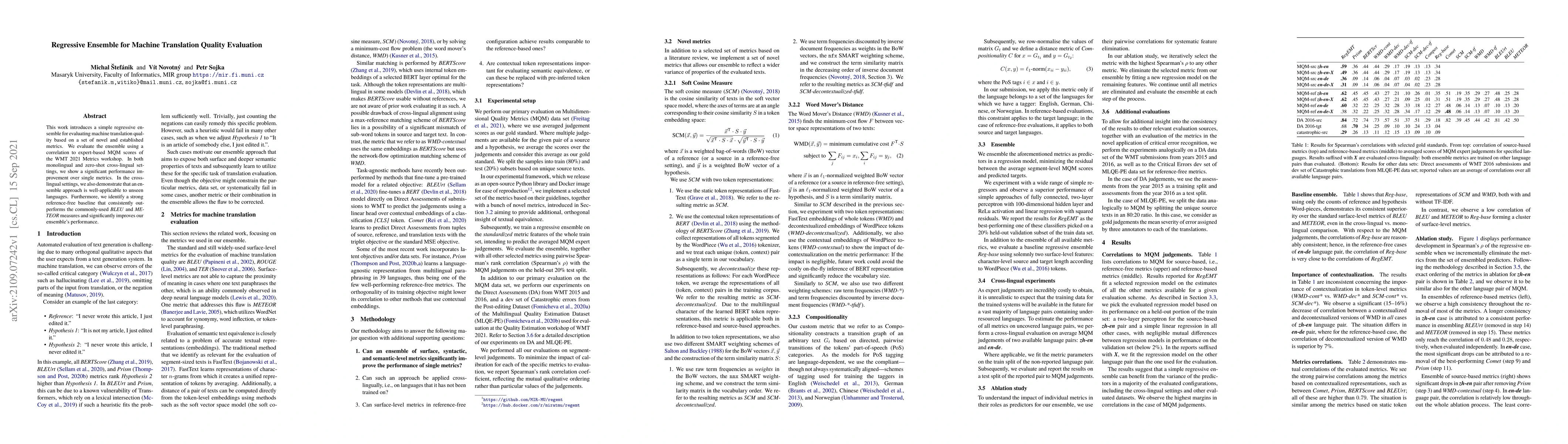 This work introduces a simple regressive ensemble for evaluating machine translation quality based on a set of novel and established metrics. We evaluate the ensemble using a correlation to expert-based MQM scores of the WMT 2021 Metrics workshop. In both monolingual and zero-shot cross-lingual settings, we show a significant performance improvement over single metrics. In the cross-lingual settings, we also demonstrate that an ensemble approach is well-applicable to unseen languages. Furthermore, we identify a strong reference-free baseline that consistently outperforms the commonly-used BLEU and METEOR measures and significantly improves our ensemble's performance.